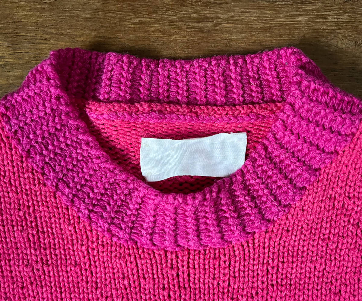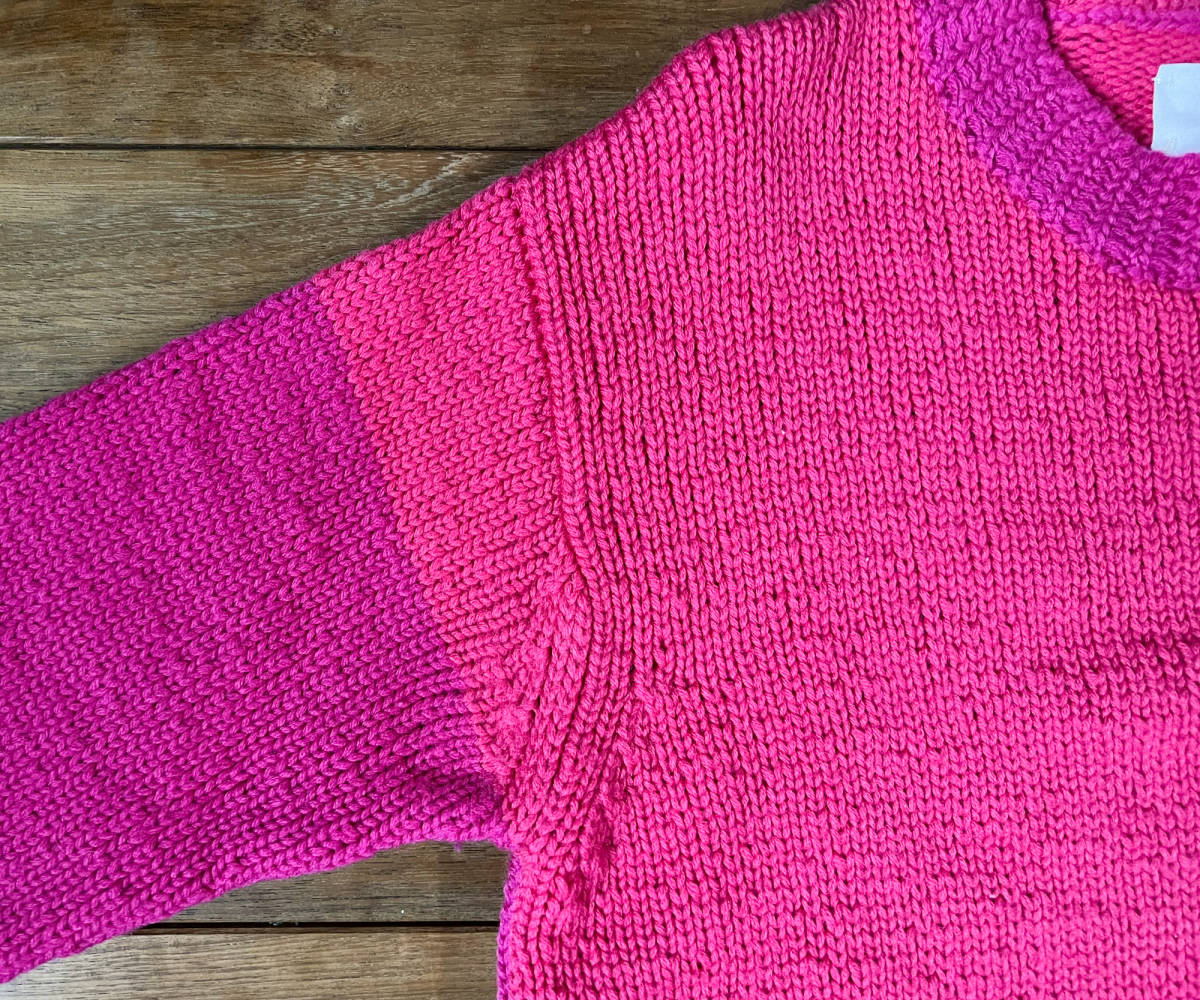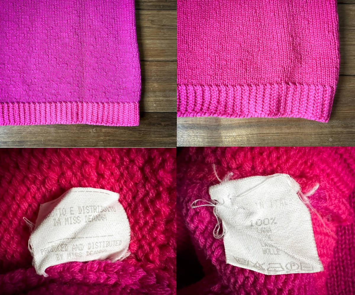 ニットやカットソーのファクトリーとして人気のあった「MISS DIANNA / ミスデアンナ」製。画像を見ていただくとわかりますが、昨今でも人気の3トーンの手法がこの頃より使われていて、おそらくこの頃が3トーンの初期ではないかと思われます。前身頃、後見頃、ネック、袖、袖口、裾など、濃淡ピンクによる絶妙なグラデーションで配色されています。(前面は、ネックが濃いめ、前身頃が中間、裾が明るめのピンクとなっています) またよく見ると、右袖は途中から色が切り替わっており、高度な縫製テクニックが施されています。