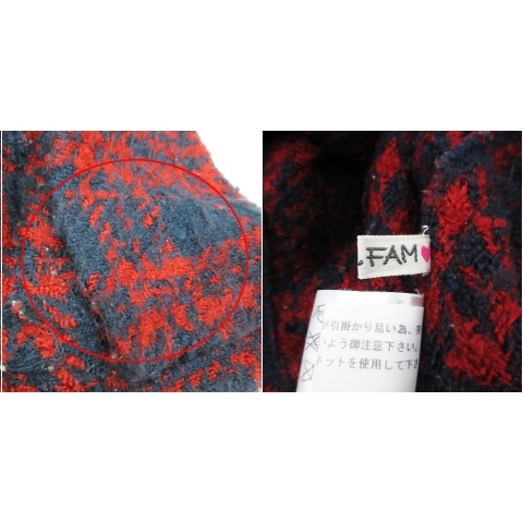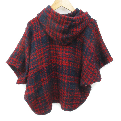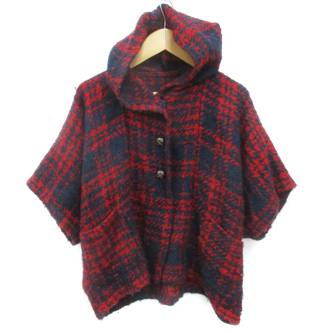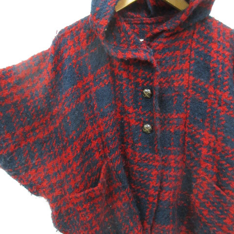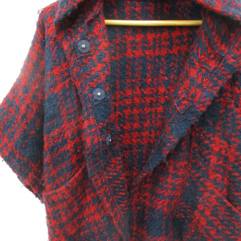 エニィファム ニットジャケット フード付き ミドル丈 五分袖 ドルマンスリーブ シングルボタン 千鳥格子柄 チェック柄 M 赤 紺 レディース