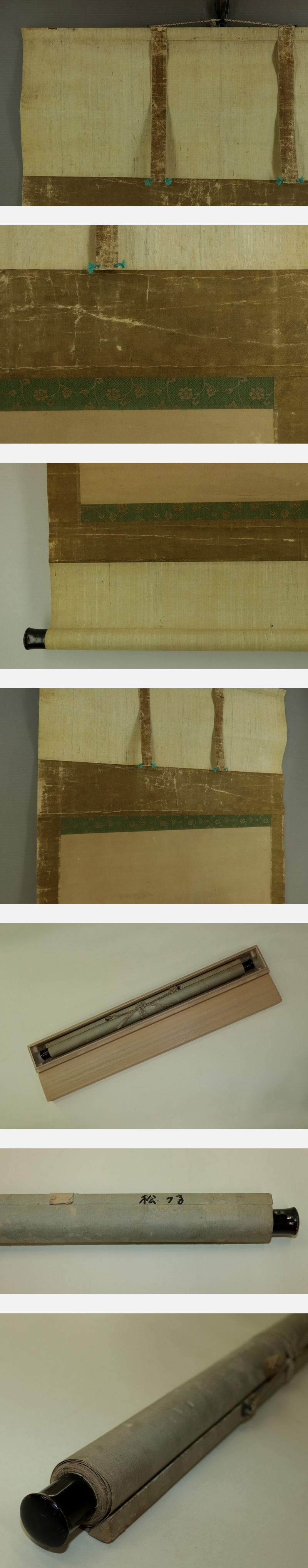 狩野周信 かのう-ちかのぶ(1660-1728) 江戸時代前期-中期の画家。 万治3年7月2日生まれ。狩野常信の長男。 延宝6年、江戸城障壁画制作に参加。正徳3年(1713)木挽町狩野家を継ぐ。 享保4年法眼となり,朝鮮への贈呈屏風を手がけた。享保13年1月6日死去。69歳。 通称は右近。号は如川,泰寓斎。 本紙は、染み、汚れ、折れ、皺、虫食い、ヤケ、擦れがあります。 表装は、染み、汚れ、強い折れ、皺、虫食い、破れ、ほつれ、ヤケ、修理痕、 軸先に小傷があります。 【サイズ】 作品 横約49cm×縦約123cm 表装 横約56cm×縦約174cm |