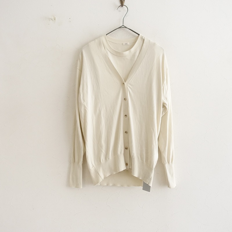 IENAのfilartex V/N アンサンブルです。カラーは生成でハイゲージの薄手ニット地で仕立てられております。カーディガンとノースリーブのセットアイテムで、定価(メーカー希望小売価格)17,600円 税込みの商品です。 |