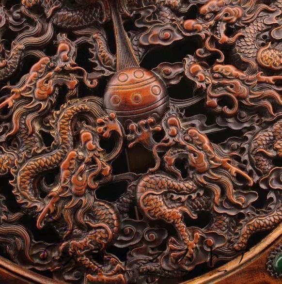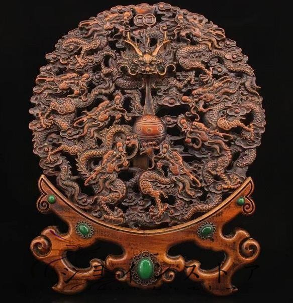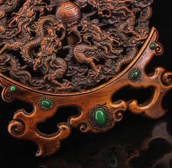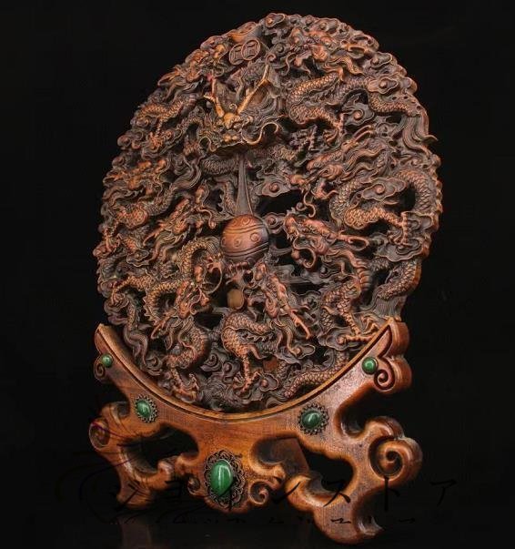高級製品! 九龍戯珠 (龍・竜・雲)高37 cm 参次元透かし彫刻 木製台座付