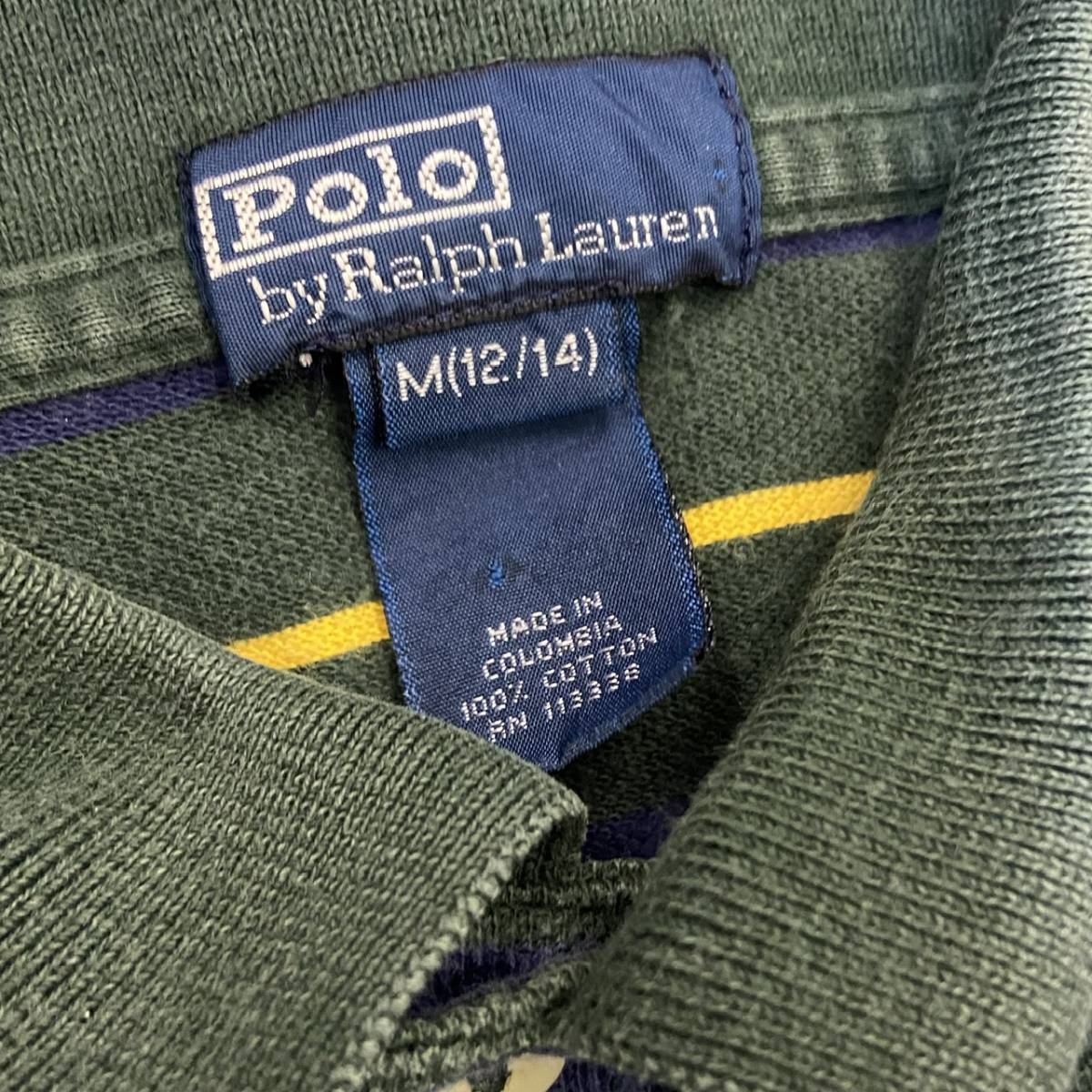 90s Polo Ralph Lauren ポロシャツ Youth M (12/14) グリーン ボーダー柄 ポニー ロゴ 刺繍 半袖 ラガーシャツ ポロ ラルフローレン