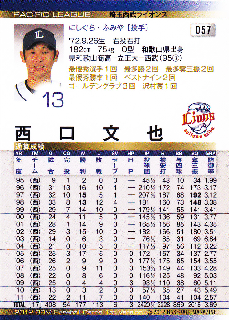 2012BBMベースボールカード1st 057 西口文也 西武 和歌山県 和歌山商業高校 立正大学