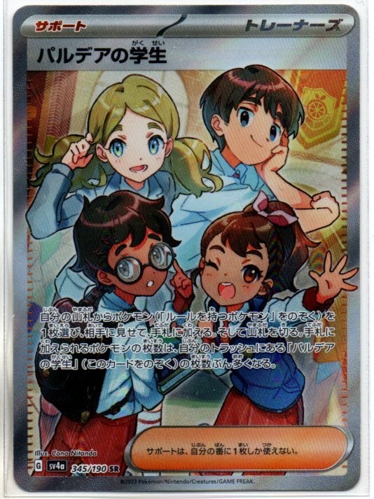 ポケモンカード sv4a シャイニートレジャーex パルデアの学生 (SR)1枚です。カードの状態はパック開封後スリーブに入れて保管していました、未使用ですが初期傷等はご了承下さい。(カード縁切断時微キズ・製造時表面微キズ及び画面上のホロ加工切目が多く見られます。ご了承の上、ご入札願います。)