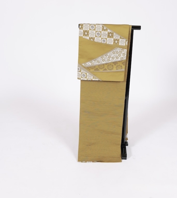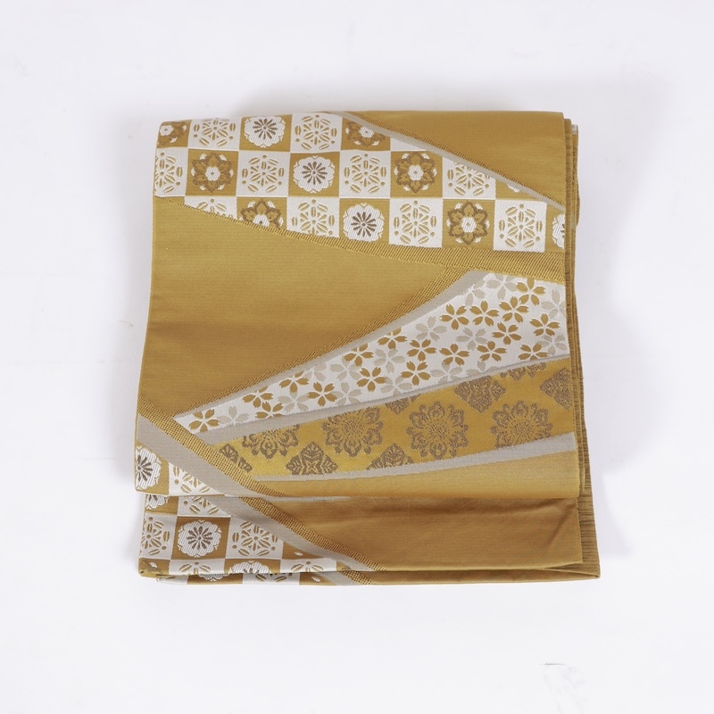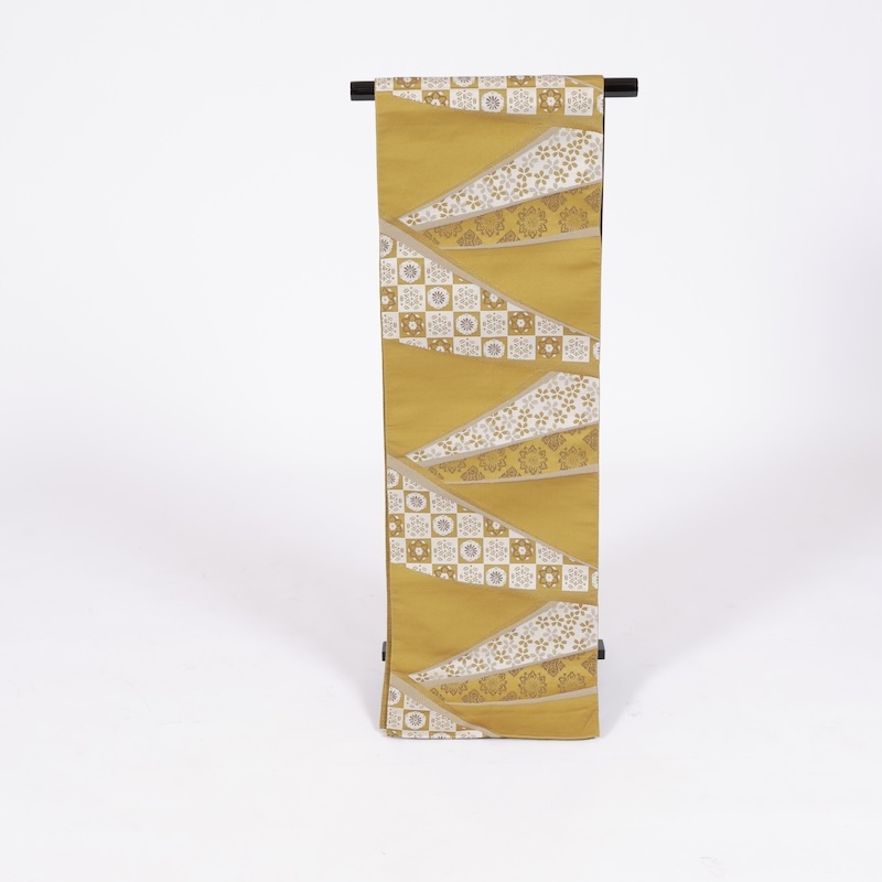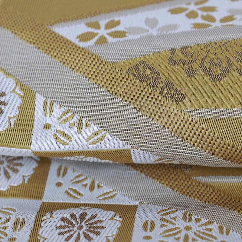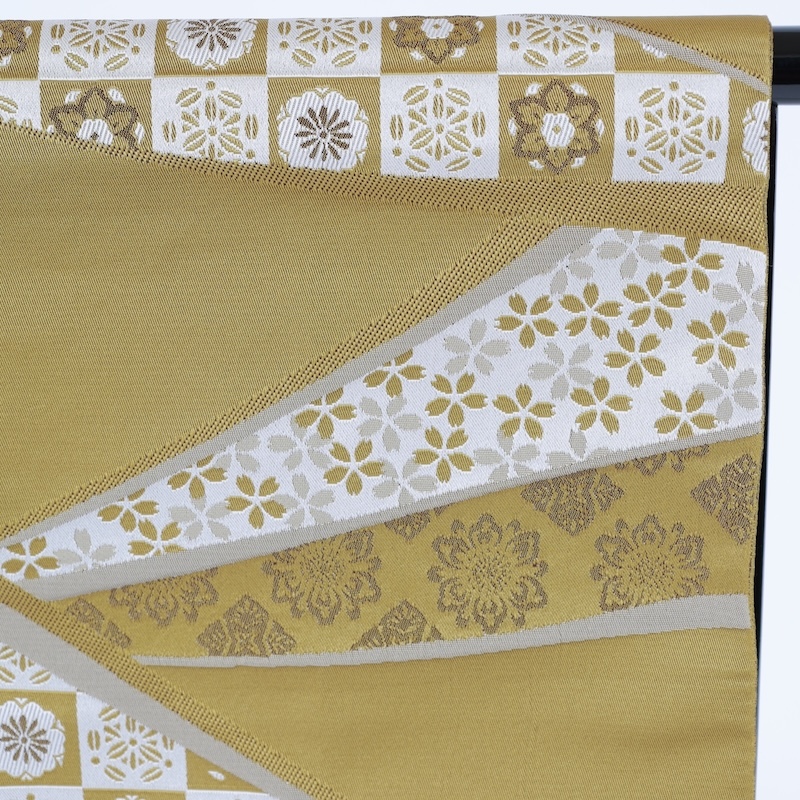 カラシをベースにグレー、茶、白で幾何学模様を織り上げたオシャレなお品になります。