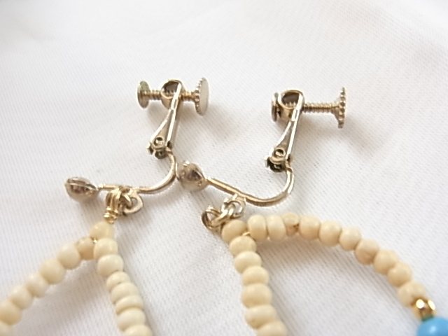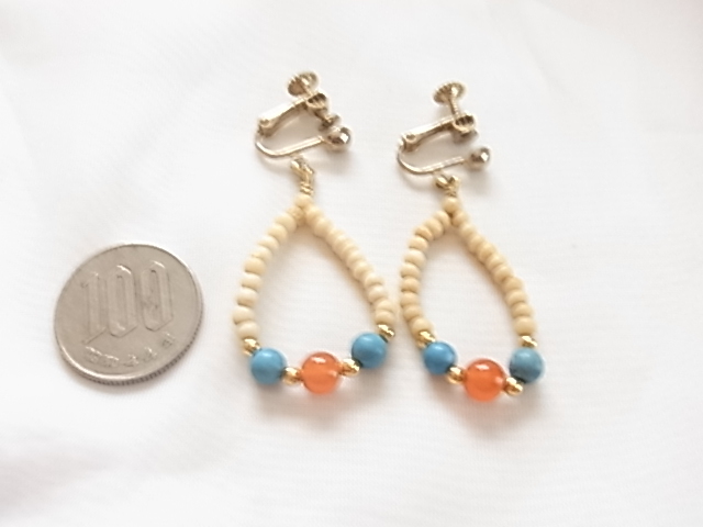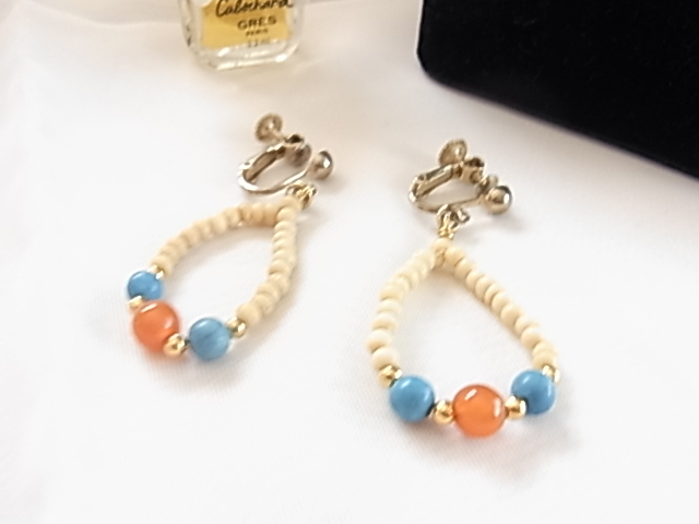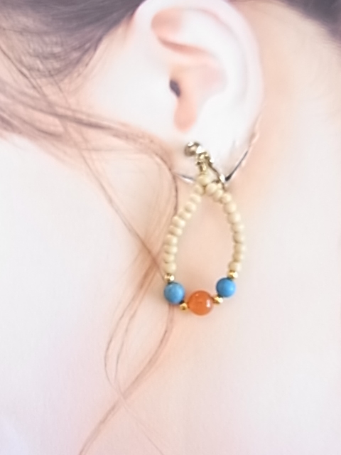 アイボリーホワイトとスカイブルーとビタミンオレンジカラーのビーズストーン 差し色が金色 耳元で揺れて可愛いデザインのイヤリング◆