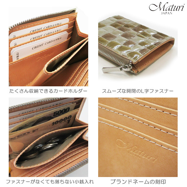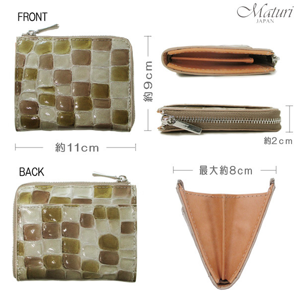 | 毎日お使いいただきたいという想いで、生地は弊社こだわりのイタリアンレザーの中から手に馴染む柔らかいものを使用しました。 可愛さをアピールするような、L字ファスナーのコンパクトなお財布。 牛革を使用しているとは思えないルックスで、 ジュエリーのような可愛いカラーと、ぷっくりとした手触りが女性の心を惹きつけます。 凹凸のあるエナメル加工で、多少の水滴もサッと拭き取れ、 トレンドのミニバッグにもスッと入ります。 コンビニやちょっとしたお買い物はポケットIN。 L字を開くと中仕切りがあり、真ん中ポケットに小銭、両側にお札やカードを収納できます。 全体が見やすく出し入れもスムーズ。 カード収納が多く、手放せない便利なお財布です。 ■定価19800円 ■カラー:ゴールド ■サイズ(約):縦9cm×横11cm×マチ2.5cm (商品によっては多少の誤差があります。予めご了承下さい。 ■素材:外側/牛革(クロコ型押しエナメル加工)、内側/ボンテッドレザー ■仕様:ファスナー開閉、小銭入れ(中仕切り)×1、札入れ×2、カード入れ×8、オープンポケット(外側)×1 ■付属:Maturi専用BOX ■新品・未使用 ※一部共通画像使用 【ご注意】 ※商品によって柄の大きさや形が異なります。また、気泡がある場合がございますが、これらは全て選べません。 ※新品未使用ですが、製造過程により商品によっては、小さいな黒点、細かな傷・汚れ、シワ・擦れ等がある場合がございます。 また、多少の縫製ゆがみ・ノリの付着につきましては不良ではございませんので、予めご了承下さい。 ※ご覧のモニターやブラウザの設定、照明等により、画像と実物の色合いが若干異なる場合がございます。 これらについては予めご理解頂いた上でご購入下さい。 | |
