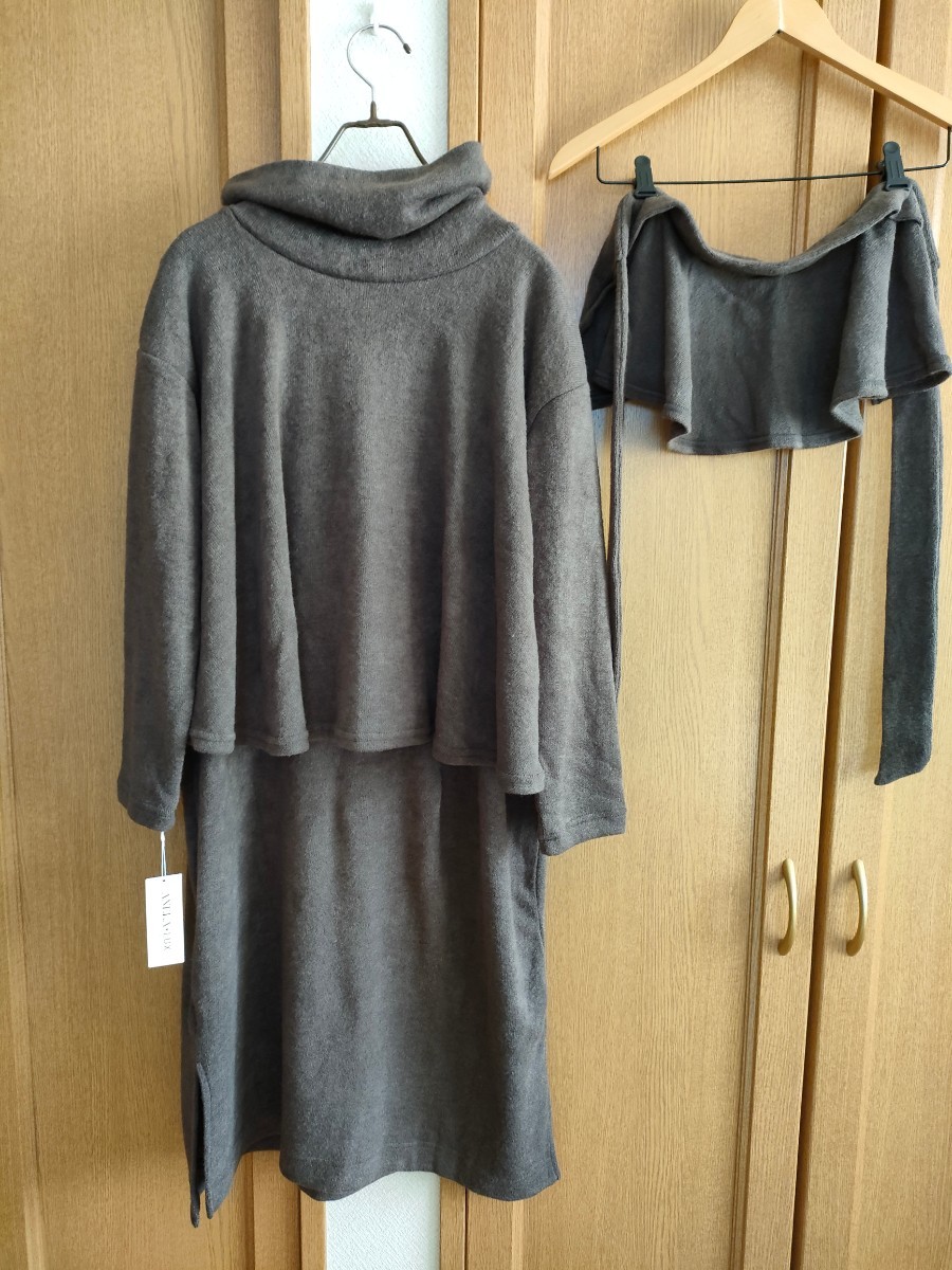 【デザイン】女性用 長袖 ハイネック ニット素材 サッシュベルト付き ロング丈 サイドスリット