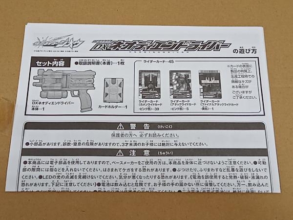 【商品詳細】ネオディエンドライバー本体…ABS・PC、カードホルダー…ABS、カード…PET【セット内容】ネオディエンドライバー本体…1、カードホルダー…1、カメンライドカード…39、アタックライドカード…5、ファイナルアタックライドカード…1、取扱説明書…1【サイズ(スケール)】ネオディエンドライバー本体…W約250mm×H約185mm×D約50mm、カードホルダー…W約75mm×H約105mm×D約25mm、カード…W約60mm×D約86mm |