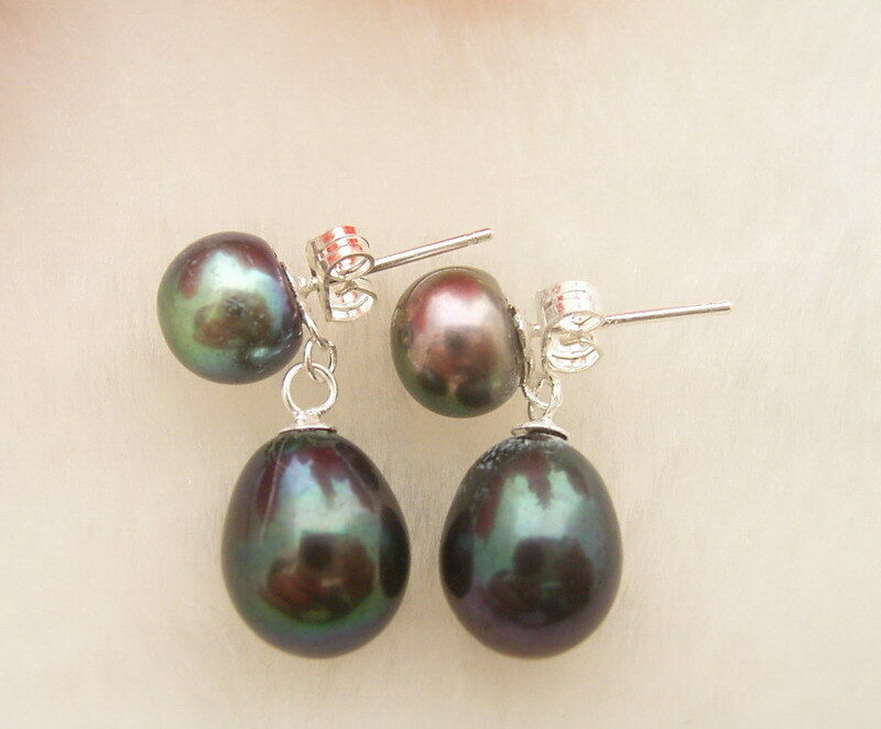 <新品>ブラック 淡水養殖 ラウンド ライス パール 真珠 925シルバー フック ピアス スタッド ダングル プレゼント パーティー