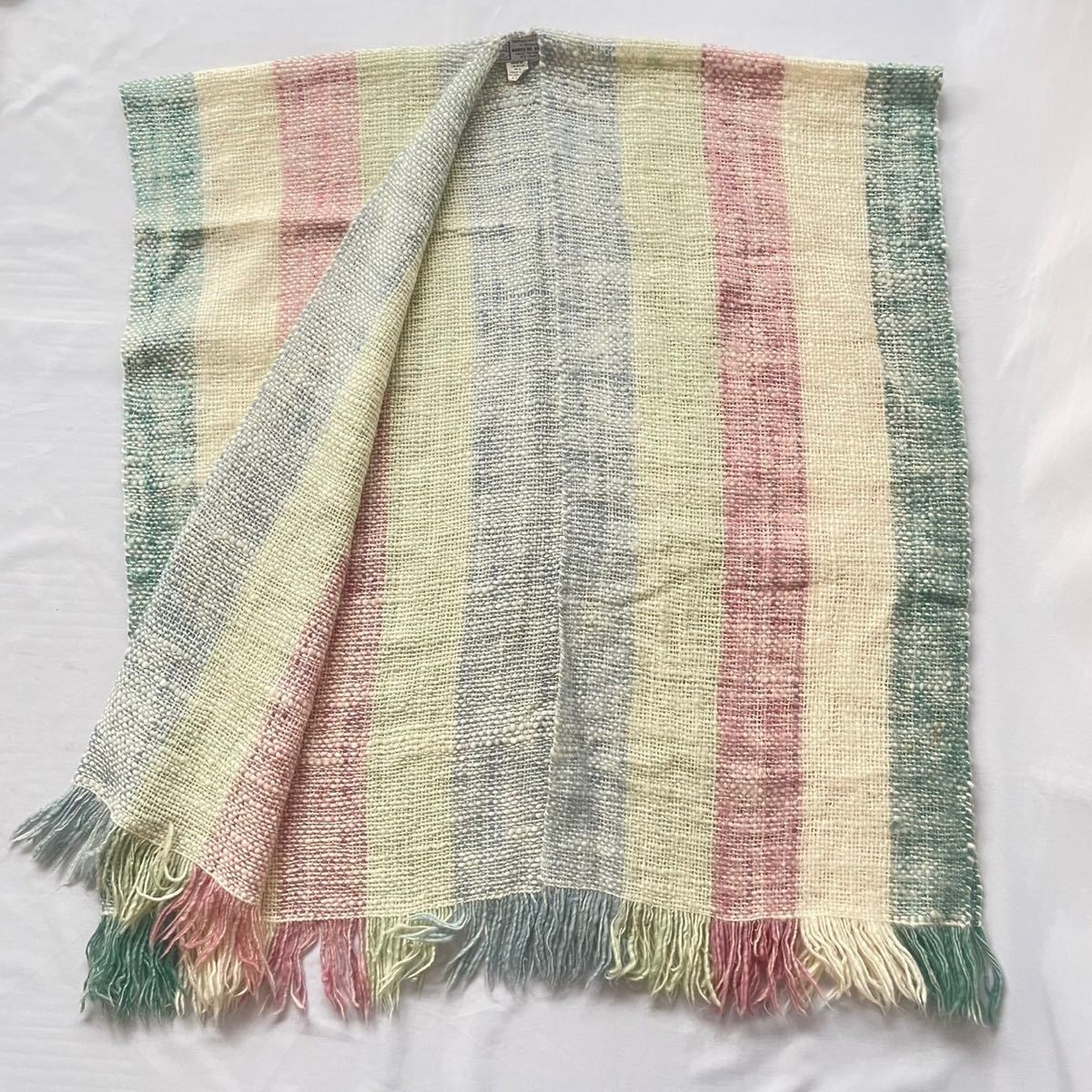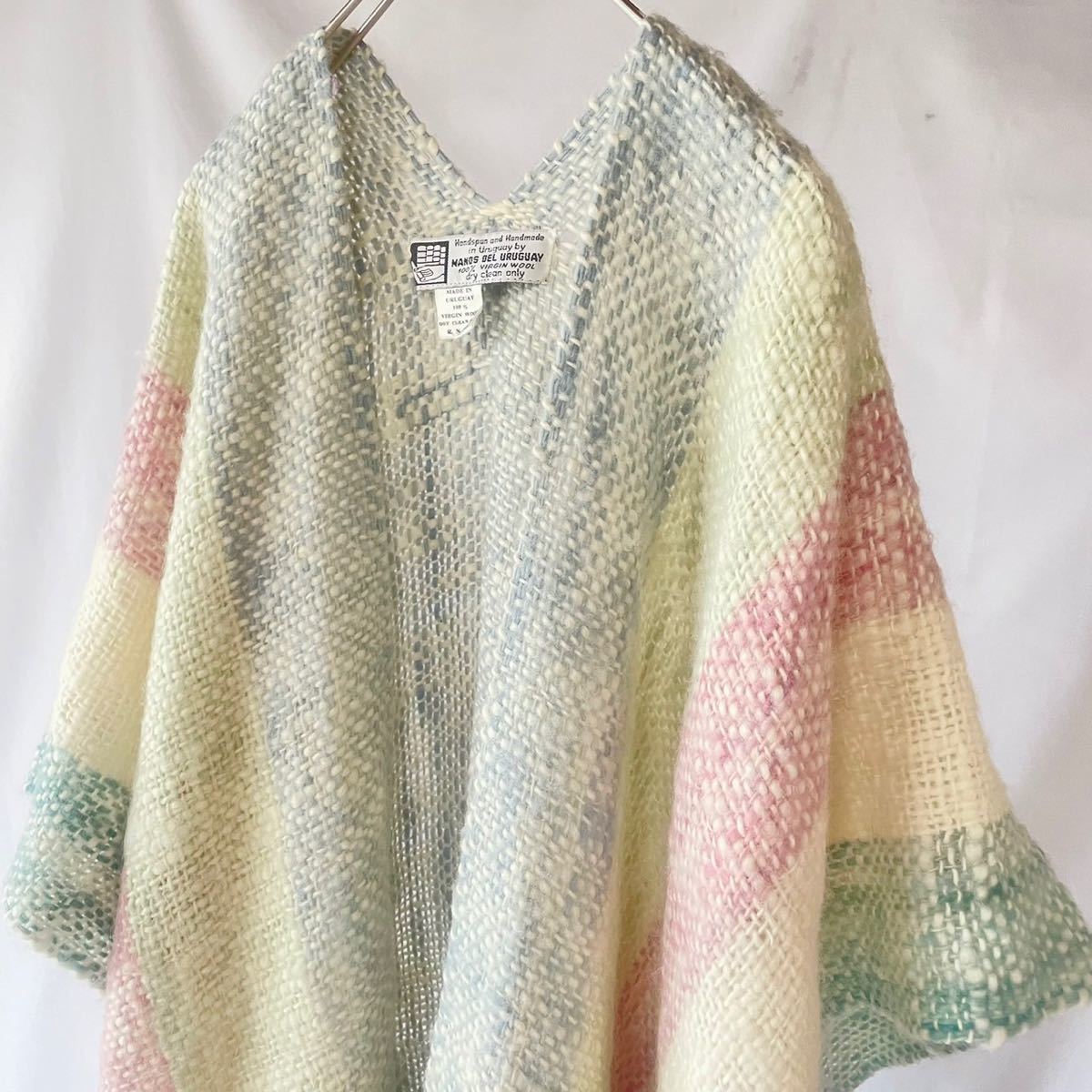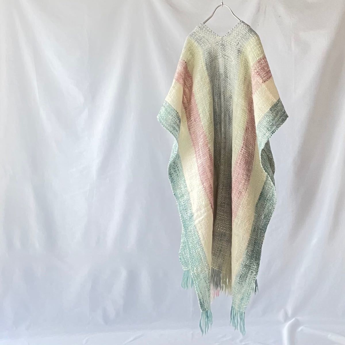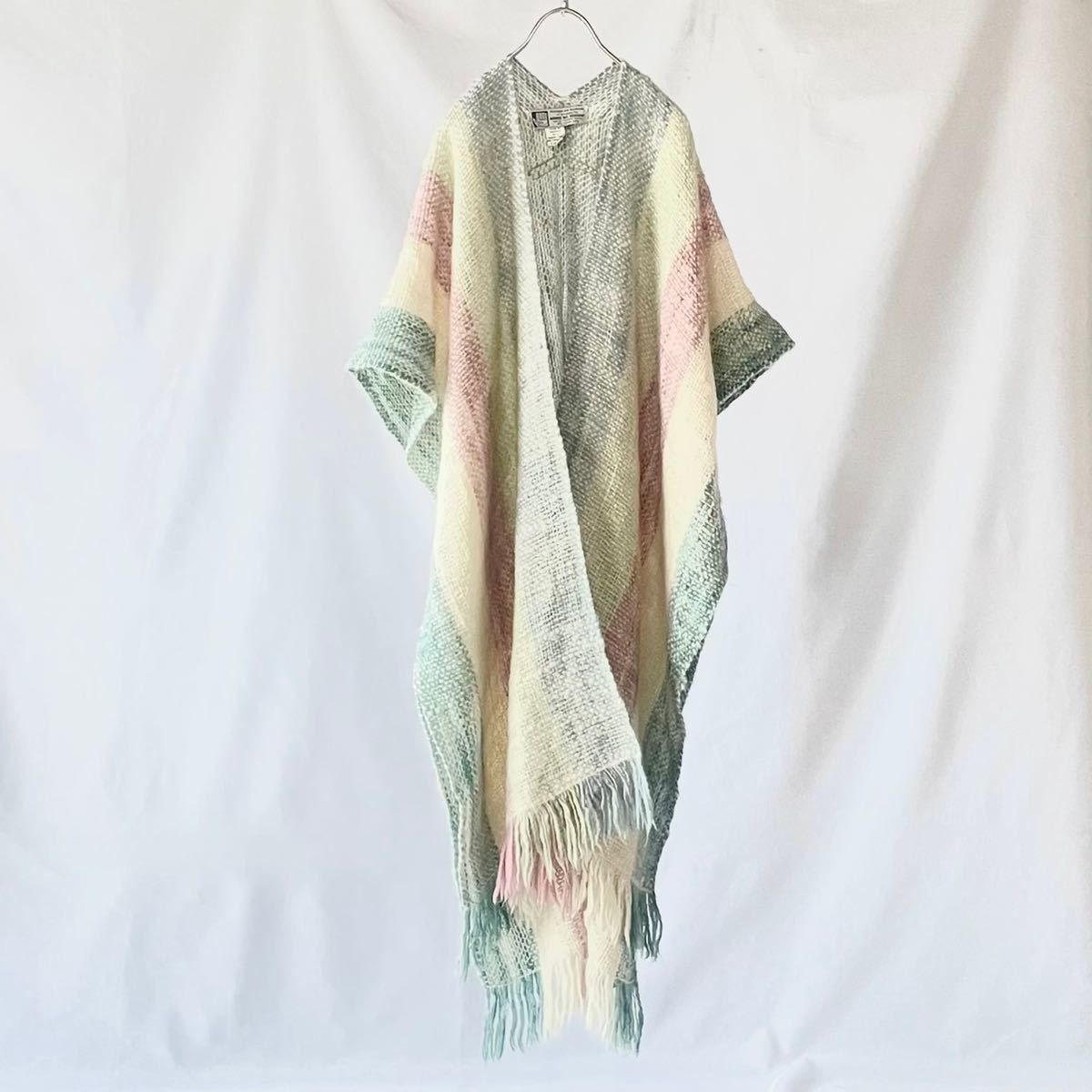 淡い柔らかな色合いで、ウルグアイ産の高品質な素材が使用されたハンドメイドのパステルカラーストライプ柄ロングケープコートです。