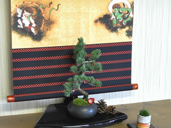 掛け軸と盆栽で落ち着く和の空間が作れます 掛け軸 飾り台(扇型)いろいろな場所に掛け軸と盆栽を飾って、和の空間が作れます。この商品は掛け軸を飾る飾り台の扇型です。同じ飾り台の平型もあります。掛け軸は別売りです。※写真は艶有りタイプですが、現在は艶無しタイプに変更しております。飾り台の扇型にミニ掛け軸を掛けたイメージです。