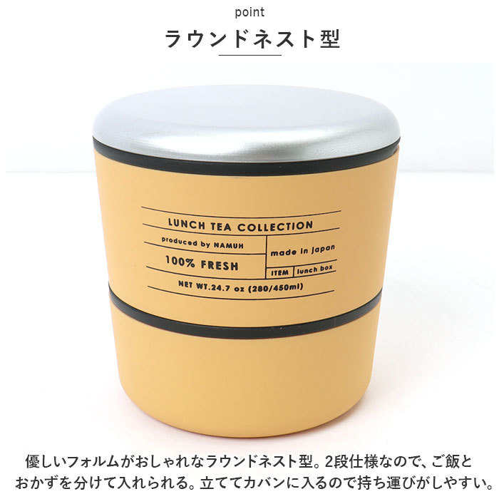 | 商品説明 | ・・ラウンドネスト型&紅茶缶のような可愛いお弁当箱で、ランチタイムをもっと楽しく♪「100%FRESH LUNCH TEA ラウンドネストランチ670ml」が登場。 ・【LUNCH TEAシリーズ】 ・紅茶缶の雰囲気を表現したおしゃれなLUNCHBOX。金属のような質感と個性的なカラーが山中漆器の塗装技術で再現された、こだわりのアイテム。 ・【ラウンドネスト型】 ・優しいフォルムがおしゃれなラウンドネスト型。2段仕様なので、ご飯とおかずを分けて入れられる。立ててカバンに入るので持ち運びがしやすい。 ・【食洗機&電子レンジ対応】 ・フタと中フタを外せば、食洗機&電子レンジ対応。毎日使うモノだから、お手入れが簡単で使いやすいのも嬉しいポイント。 ・【充実の付属品】 ・汁漏れに強い、中フタとランチバンドを付属。中フタは指を引っかけるくぼみがあるので、ストレスなく開けられる。 ・【持ち帰りはコンパクトに】 ・入れ子構造になっているので食べ終わったあとは1段に片付けられ、コンパクトに収納して帰りの荷物を小さくできる。 ・【シンプルデザイン】 ・ザラっとした上質な山中漆器の塗装をされたボディに、さり気ないロゴデザインを配置。シンプルでおしゃれなデザインなので、学校やおでかけはもちろん、オフィスでも◎ |