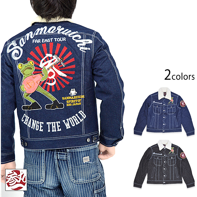 「参丸一」さんから「ロックンボアデニムジャケット(SOU-50026)」のご紹介です。 襟元にボアを切り替えた、寒い季節にぴったりのアウターが登場しました! ボディーにはデニム生地を採用し、カジュアルな仕上がりに。 フロント左胸、背中には琵琶をかき鳴らす蛙を刺繍で落とし込みました。 右胸にはブランドロゴをデザイン。 左袖にはブランドの頭文字を用いた刺繍ワッペンを縫い付けました。 両胸にはフラップ付きのポケットを、両身頃には斜めポケットをそれぞれ配置。 ボタンやオリジナルの布タグなど、細かいところにまで拘り、作りこまれた逸品です。 内側には中綿が詰め込まれており、防寒性にも優れています。 | |||||||||||||||||||||||||