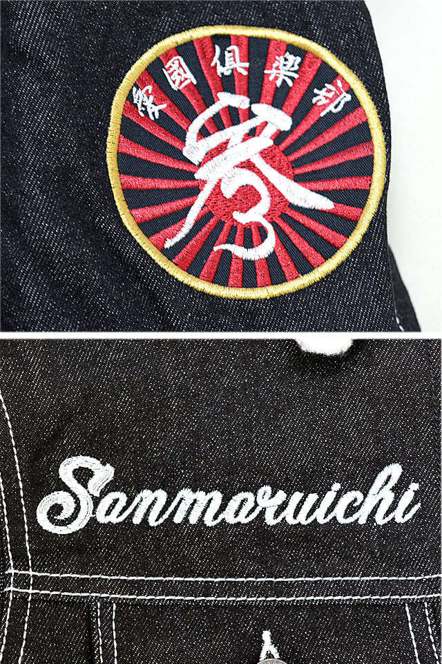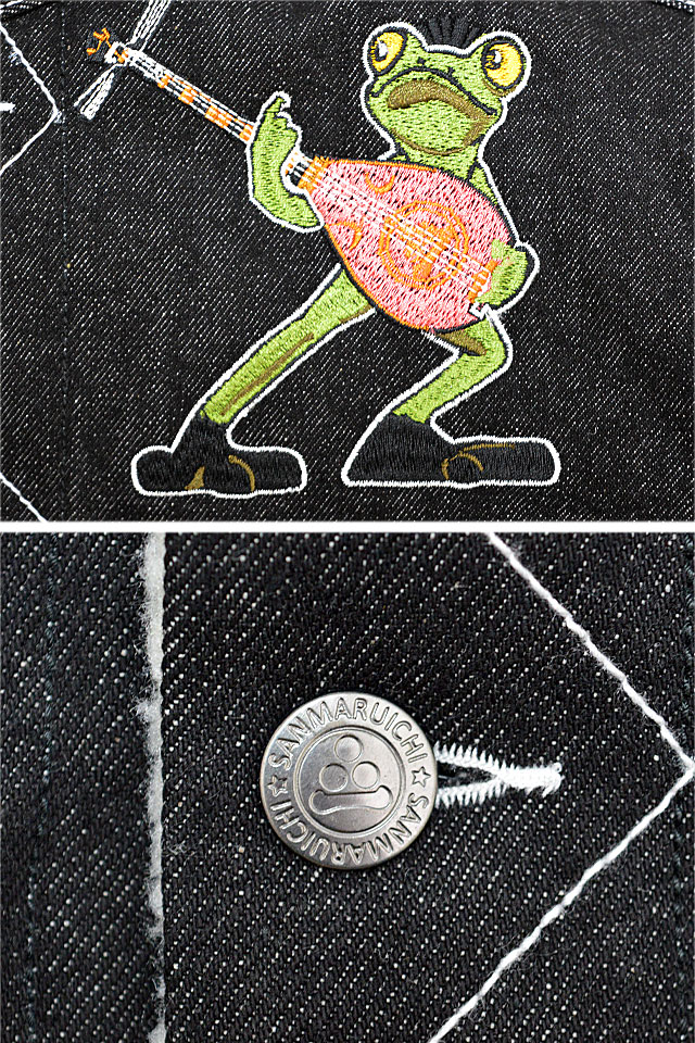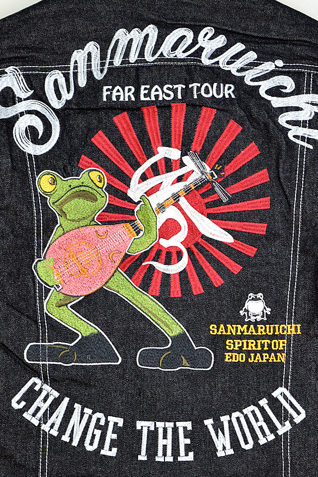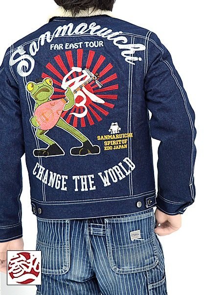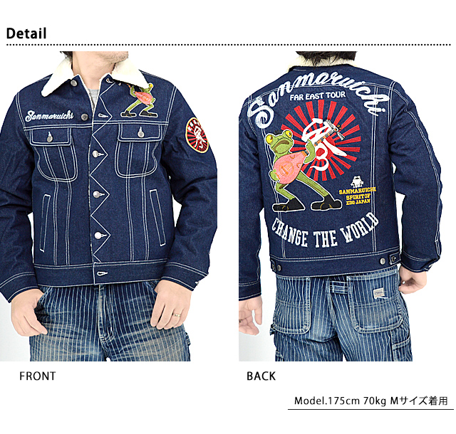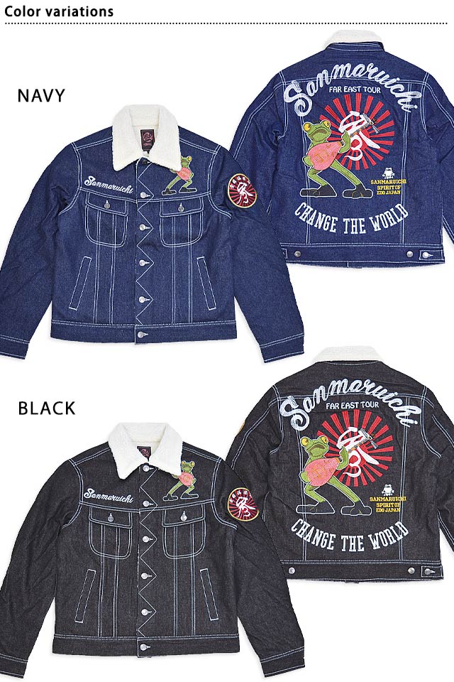 「参丸一」さんから「ロックンボアデニムジャケット(SOU-50026)」のご紹介です。 襟元にボアを切り替えた、寒い季節にぴったりのアウターが登場しました! ボディーにはデニム生地を採用し、カジュアルな仕上がりに。 フロント左胸、背中には琵琶をかき鳴らす蛙を刺繍で落とし込みました。 右胸にはブランドロゴをデザイン。 左袖にはブランドの頭文字を用いた刺繍ワッペンを縫い付けました。 両胸にはフラップ付きのポケットを、両身頃には斜めポケットをそれぞれ配置。 ボタンやオリジナルの布タグなど、細かいところにまで拘り、作りこまれた逸品です。 内側には中綿が詰め込まれており、防寒性にも優れています。 | |||||||||||||||||||||||||