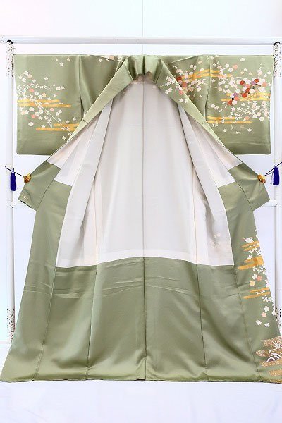 【送料無料】美品 訪問着 京友禅 金彩加工 花籠 鴛鴦 薄い抹茶色 トールサイズ 身丈172cm 入学式 卒業式 お洒落 上品  正絹 m-5357 |