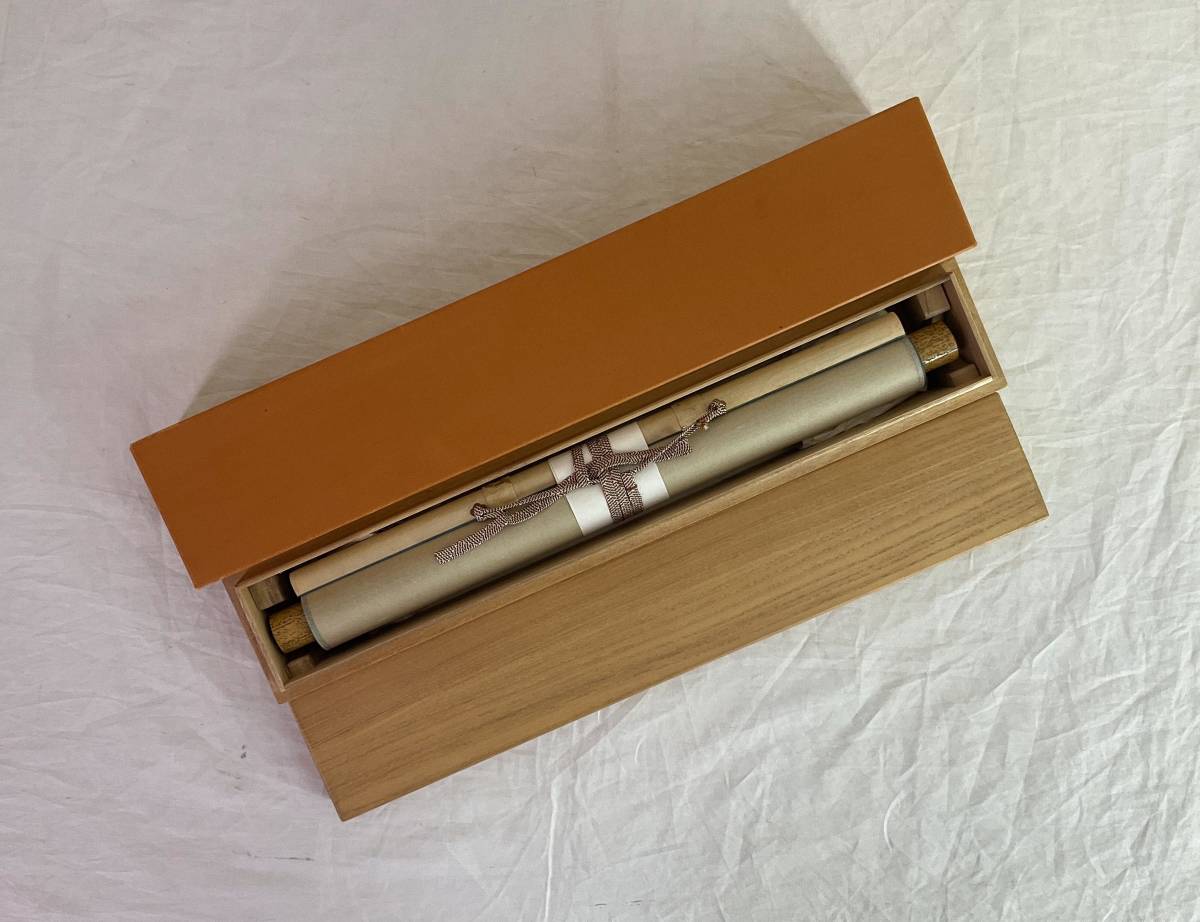 古い掛け軸は軸先を固定している接着剤が弱り、輸送途中の衝撃で軸先が外れてしまう場合がございます。