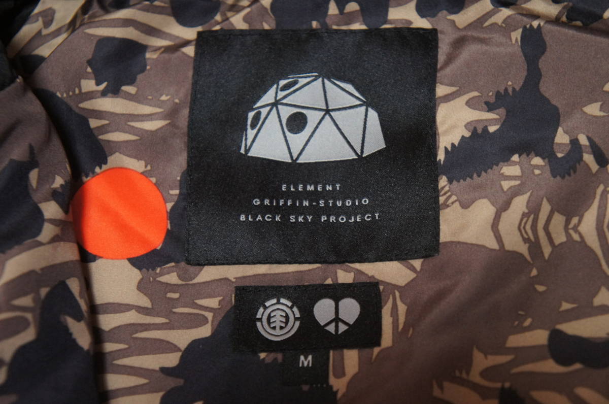 新品 エレメント ELEMENT ダウンジャケット アウター ジャンバー   ジャケット  格安 GRIHHIN STUDIO コラボ BLACK SKY PROJECT  定価47,300円 US Mサイズ 大き目で日本のLサイズ程度です。着丈68身幅57裄丈76(素人採寸の為、多少の誤差はお許し下さい。)新品未使用ですが、タグ等はありません。保管時についた気にならない程度のしわや汚れがある場合があります。