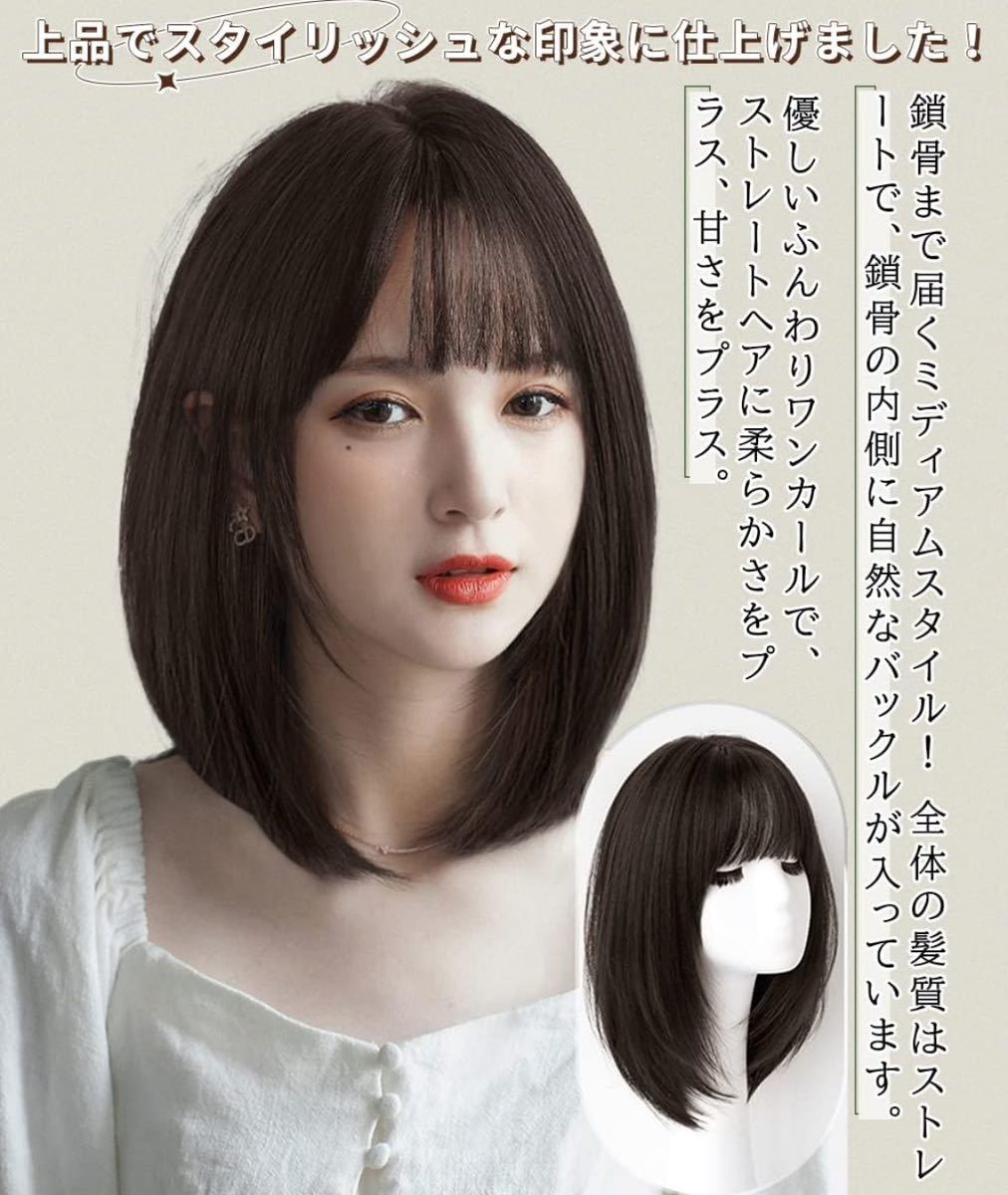 AISI HAIRウィッグ ミディアム ストレート ボブ ワンカール サラサラ ぱっつん かつら 医療用 ナチュラル 分け目自由 女性用 ブラウン