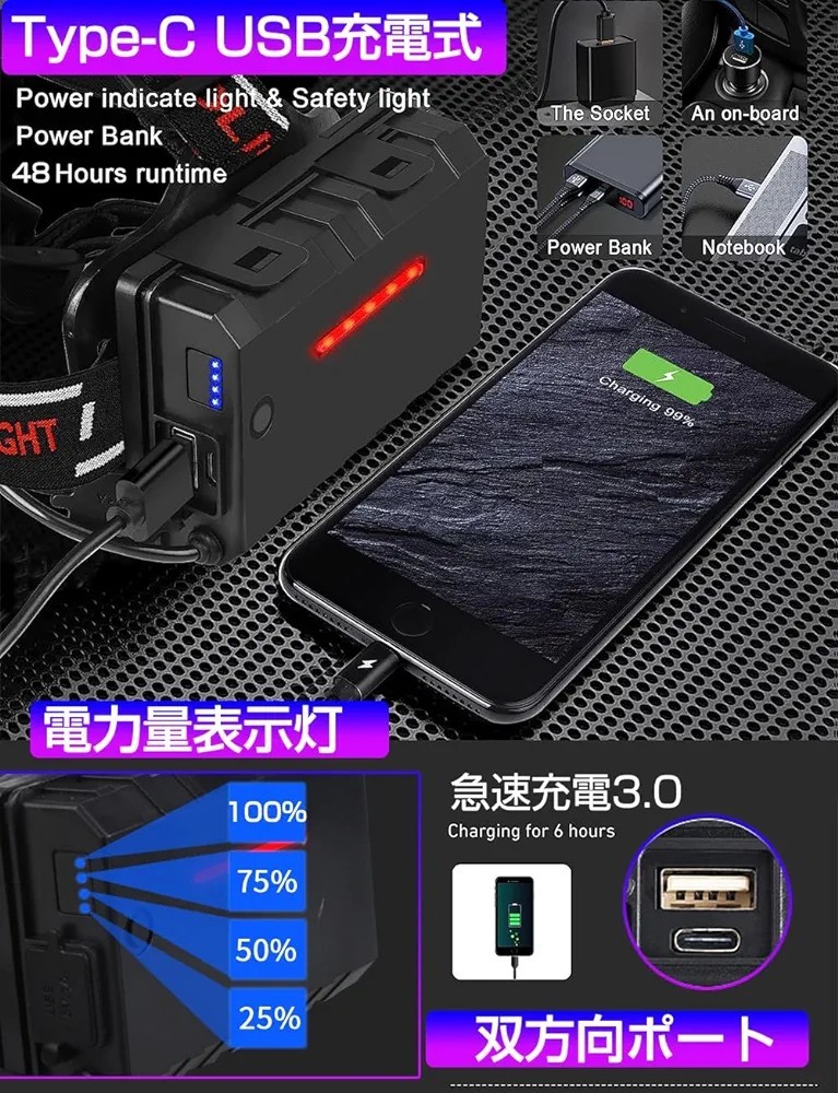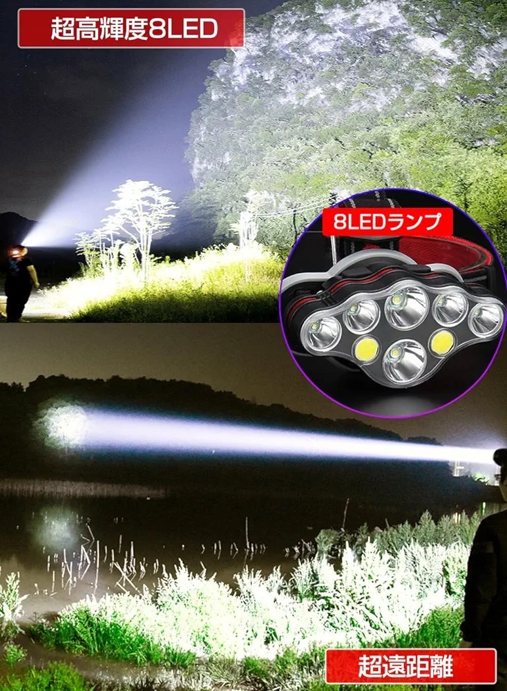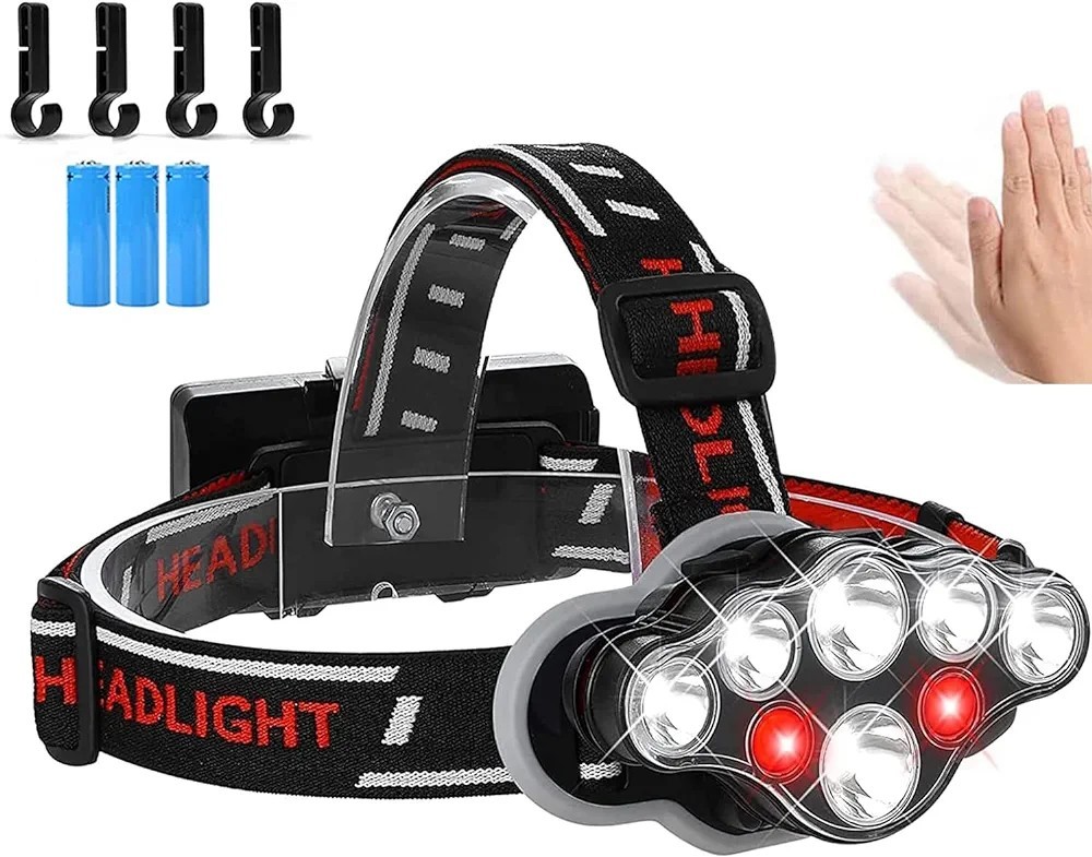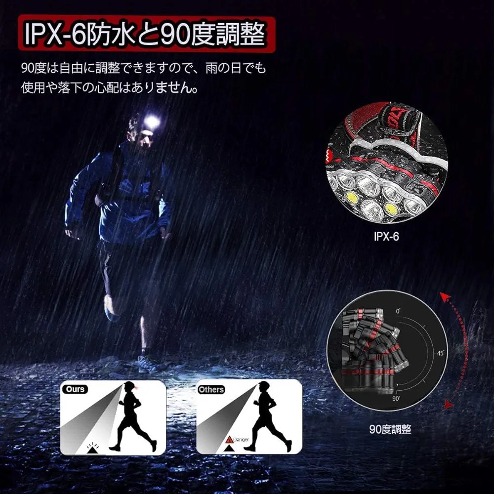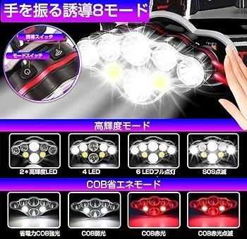 超強力 8LED】ヘッドライト led 軍用 最強 明るい 電池式 防水 Type-C タイプC 充電式【COB 赤 白色光/超高輝度 ルーメン/手振りセンサー機能付き/テールランプ/長時間 大容量 9000mAh 電池】 登山 用 軽量 ヘッドランプ usb 充電 ヘルメット用 頭につけるライト 8つの照明モード 角度調節可能 防災 アウトドア用 工事 キャンプ 夜釣り 作業用 赤色灯 4つヘルメットクリップ 3つPSE認証 18650 バッテリー型 付属