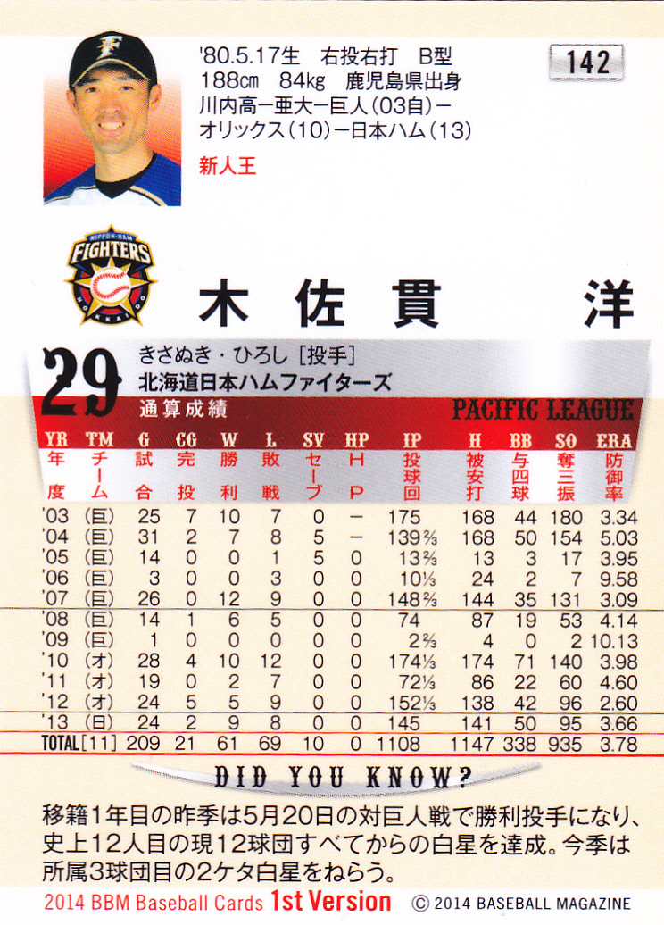 BBM2014ベースボールカード1st 142 木佐貫洋 鹿児島県 川内高校 亜細亜大 巨人 オリックス 新人王 北海道日本ハムファイターズ