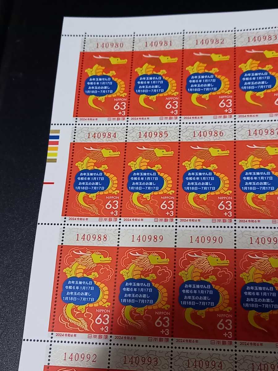 ★2024年用年賀切手、87円郵便切手1シートです。66円切手20枚です。カラーマークは左です。
