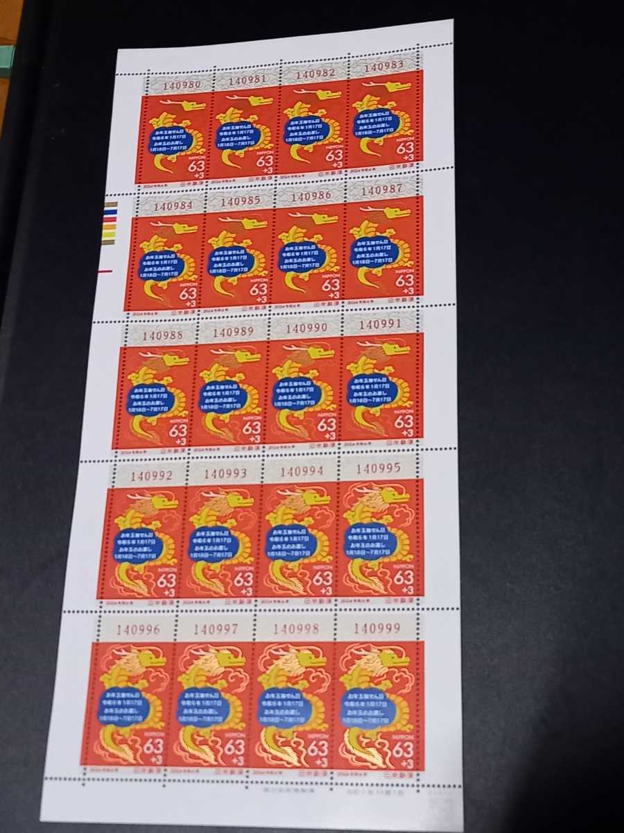 ★令和6年★2024年用 たつ年年賀切手★63円+3円=66円寄付金付き切手★1シート(20枚ブロック)★カラーマークCM左★