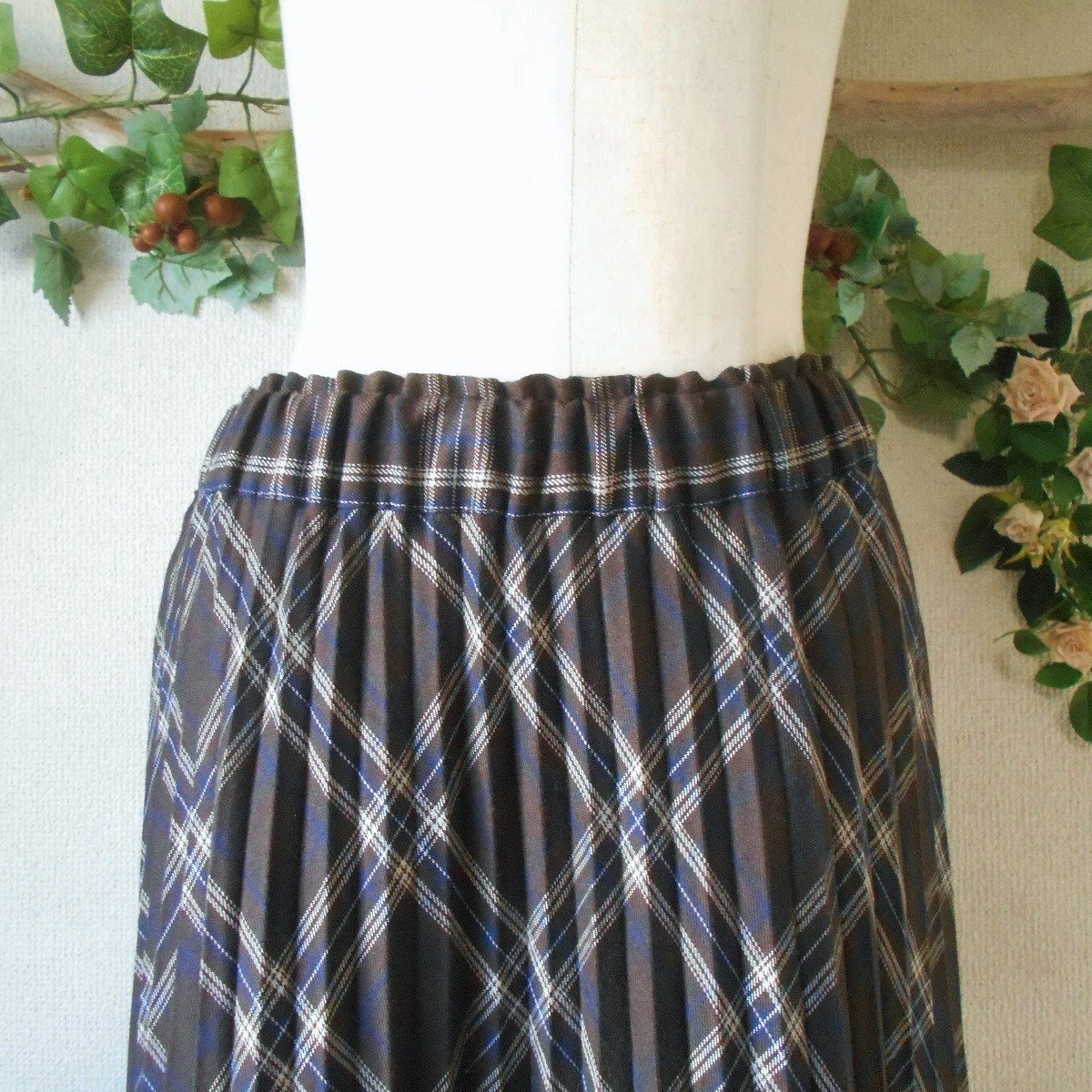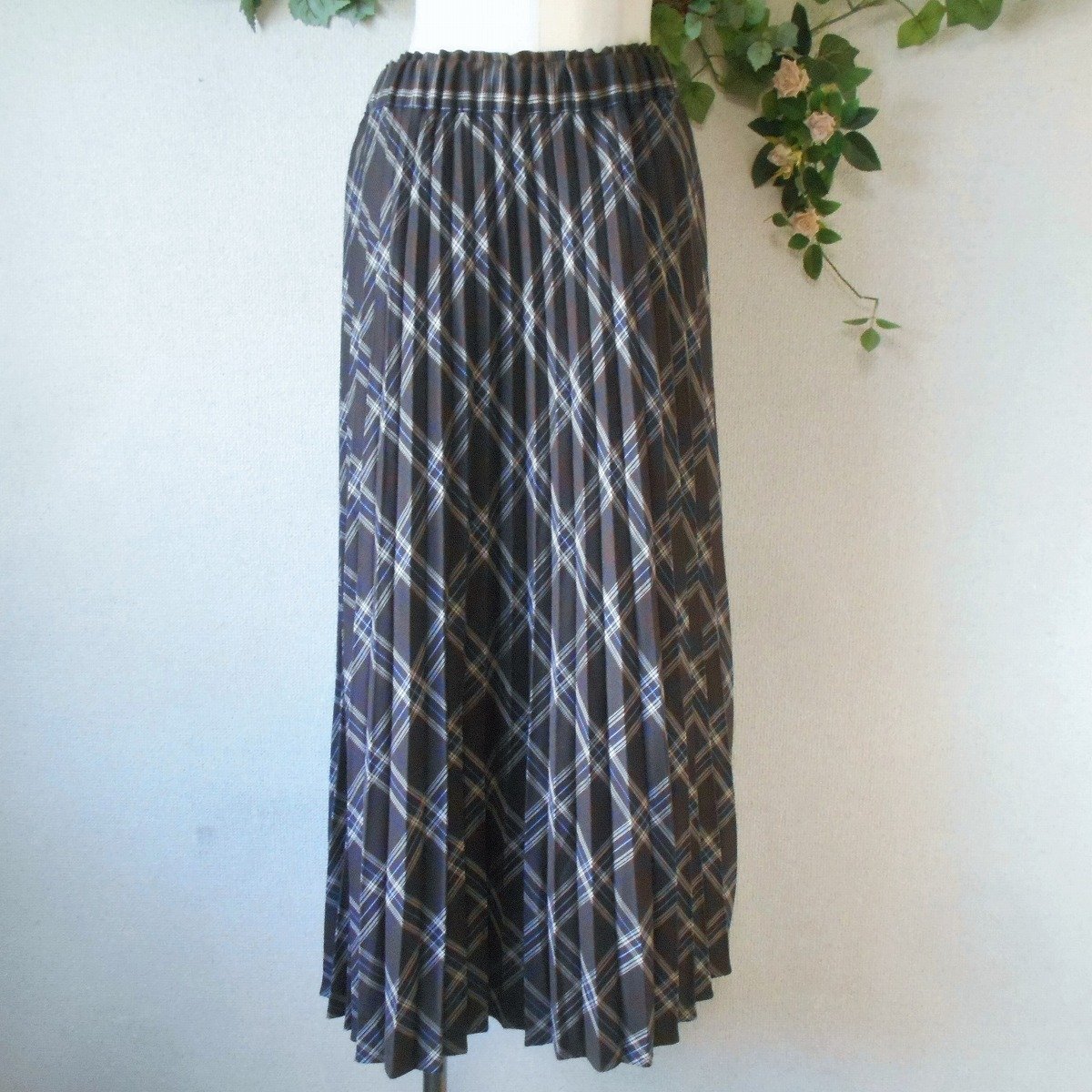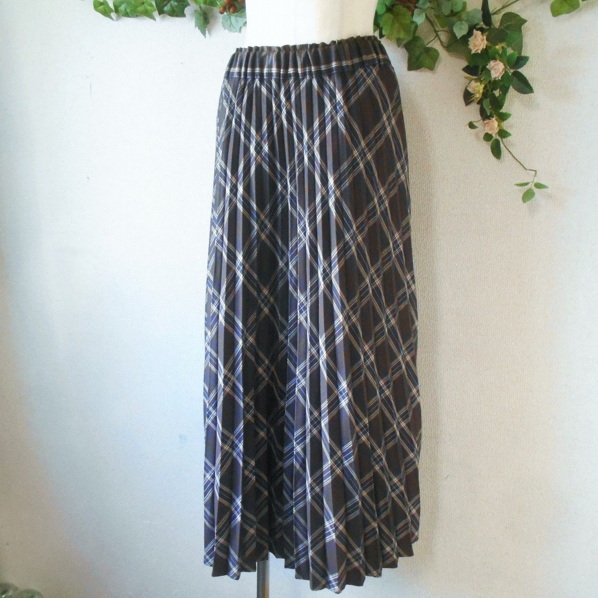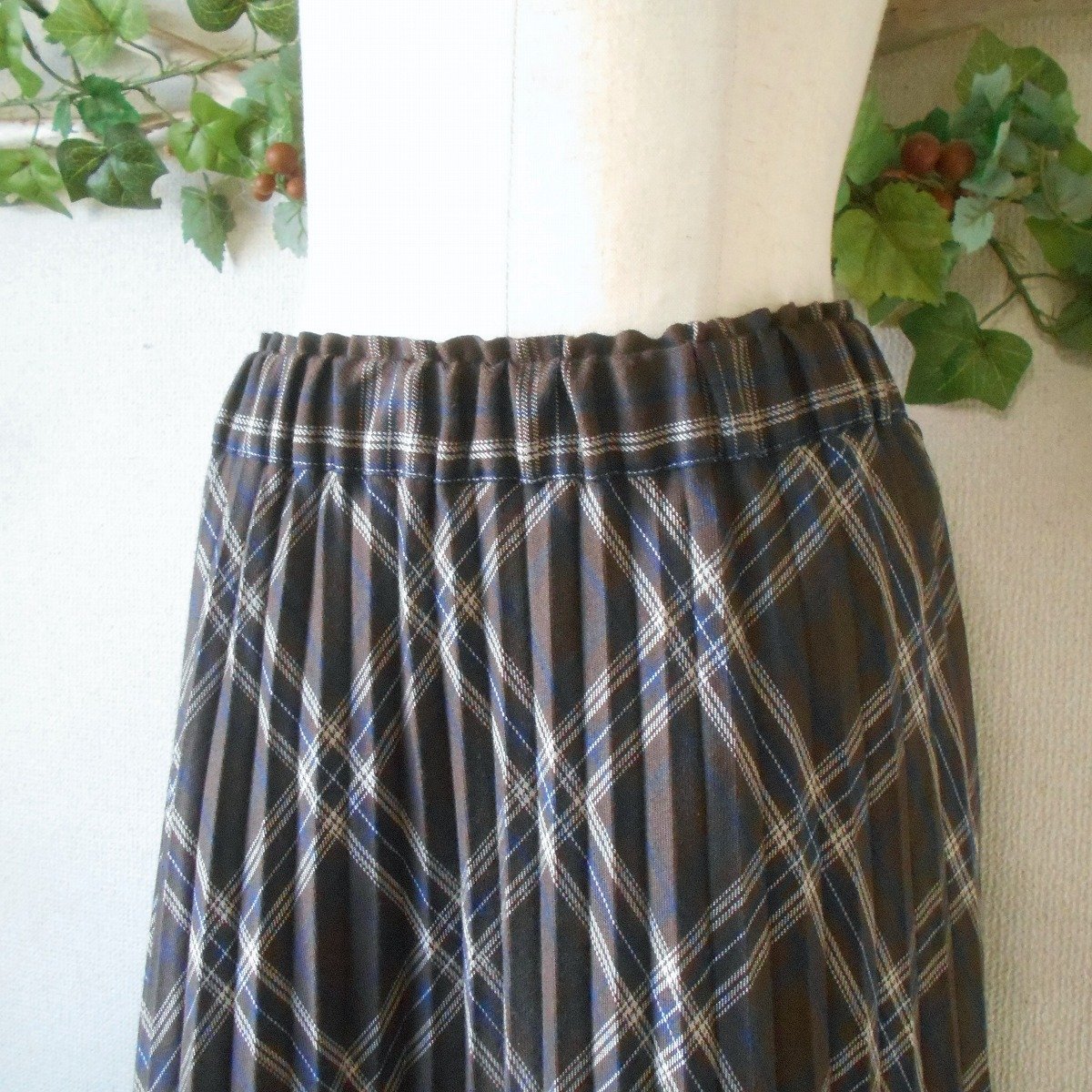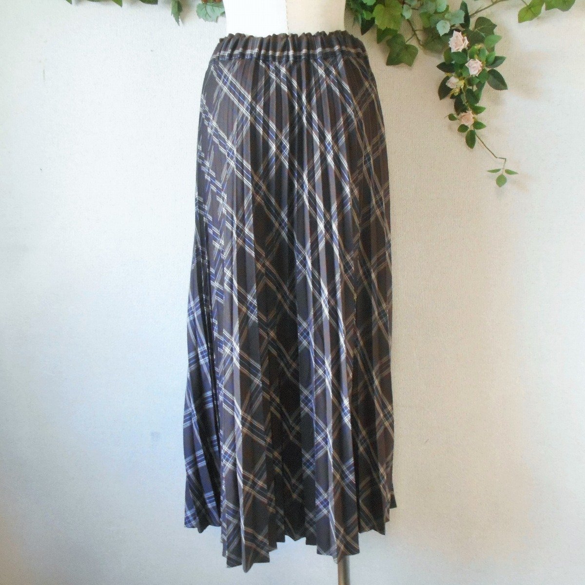 【ポイント】アースミュージック&エコロジーのスカートになります。お色はブラウン系ベースのチェック柄で秋冬を中心に着ていただけるお品です。ウエストは総ゴムでプリーツ使用のロングスカートです。