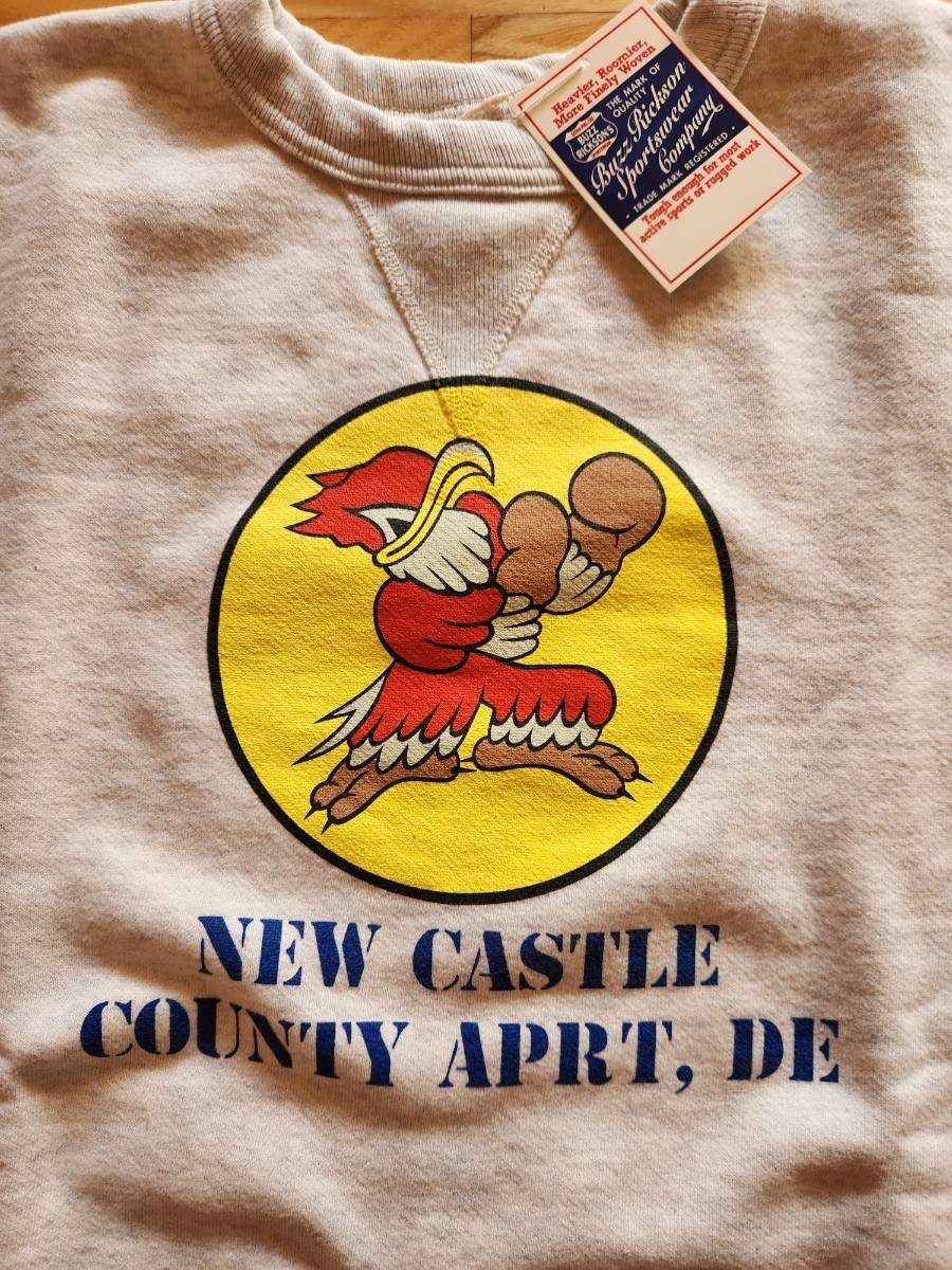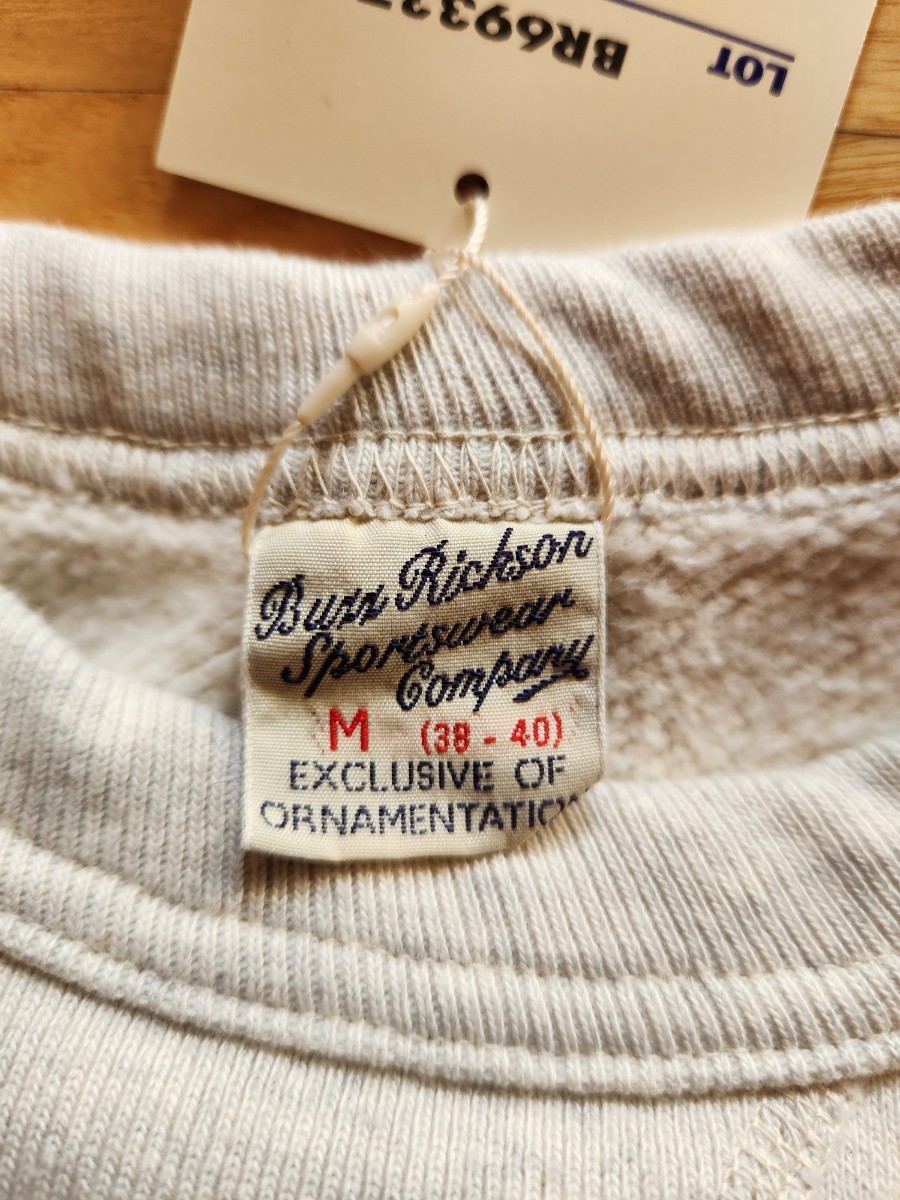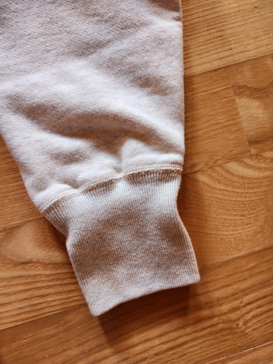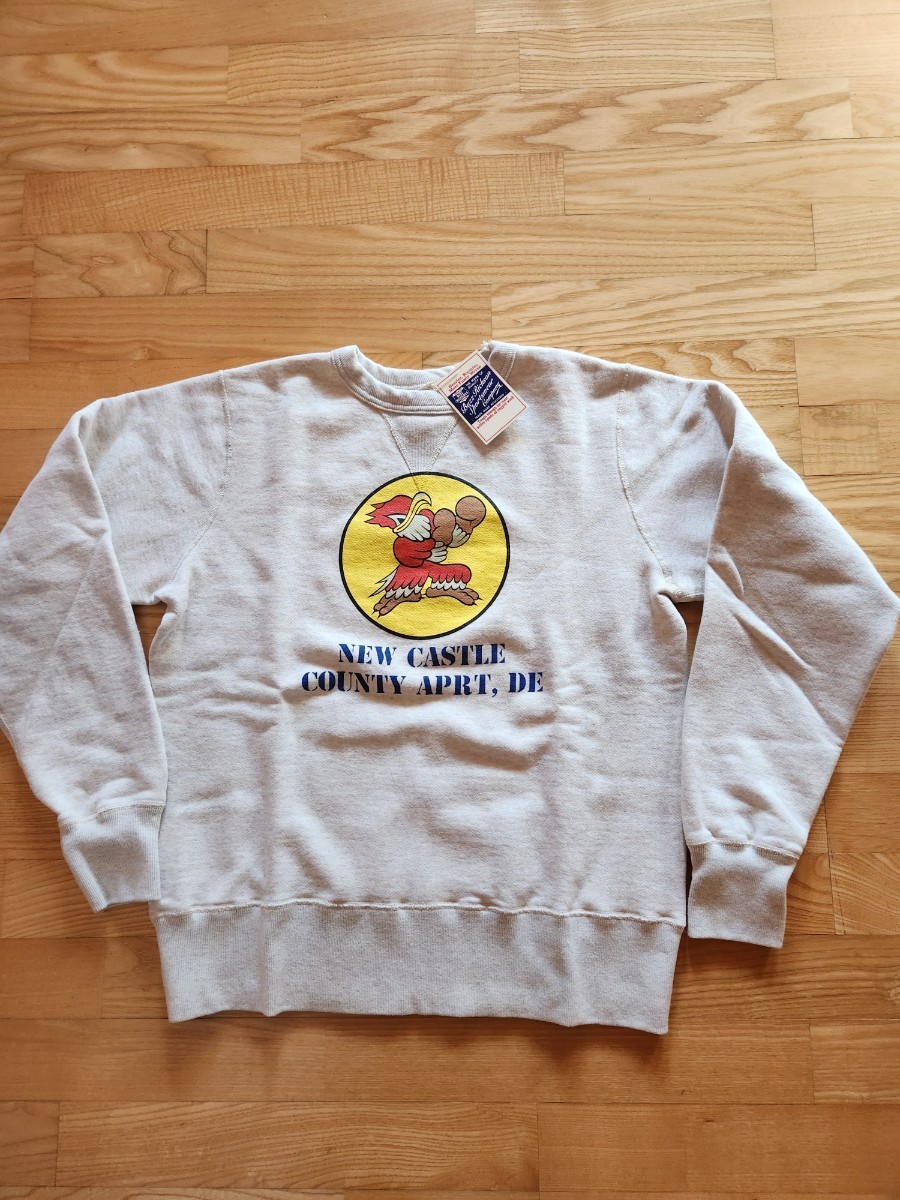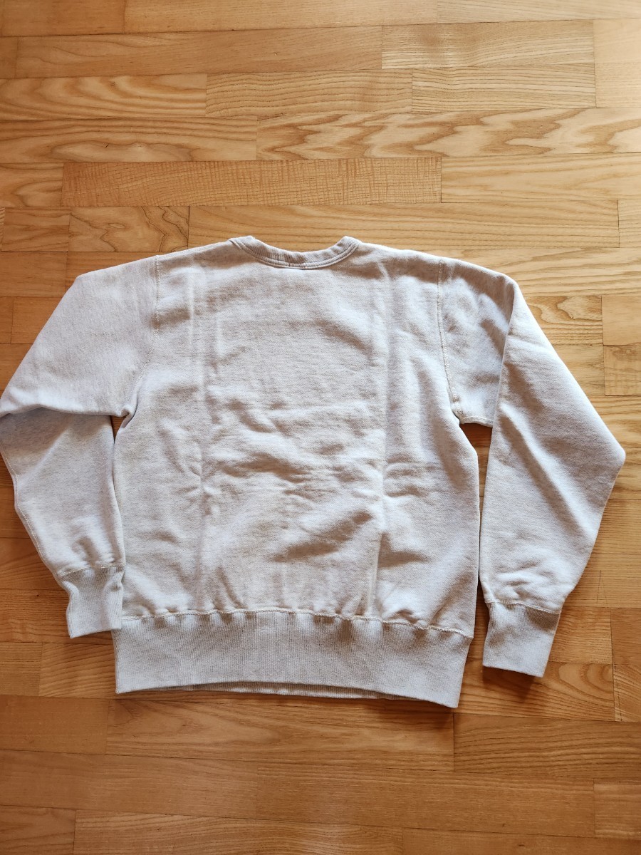 ◎特徴 ウールニットの素材からループ状の裏起毛を持つコットン素材に生まれ変わり、“汗を吸うシャツ”として米国民のデイリーウェアとして進化を遂げたスウェットシャツ。ハードなトレーニングを日常とする軍や士官学校もいち早く目を付け、全米に点在する基地売店でも扱われるようになった。素材は当時と同じように不均一なテンションで編み込まれる筒状の吊り編み機を使用しているため、特有の柔軟性を持つ素材である。縫合は肌着などに適した4本針のフラットシーマによるもので、V字型のガゼットは身頃の上にリブ素材を乗せて縫い付けた、通称“叩き付けV”の仕様。