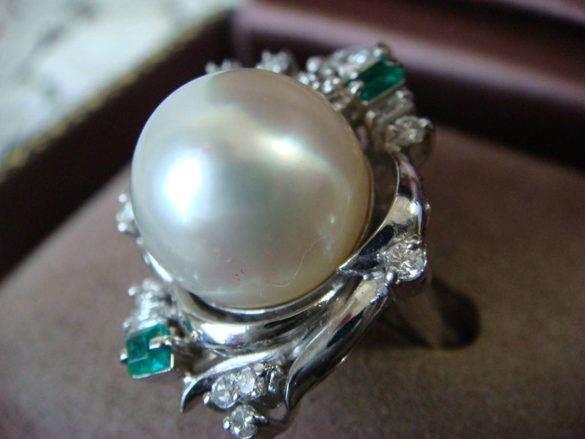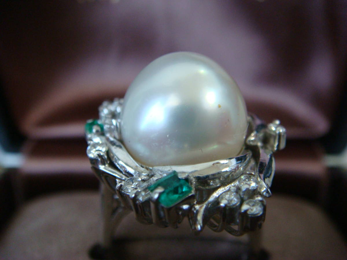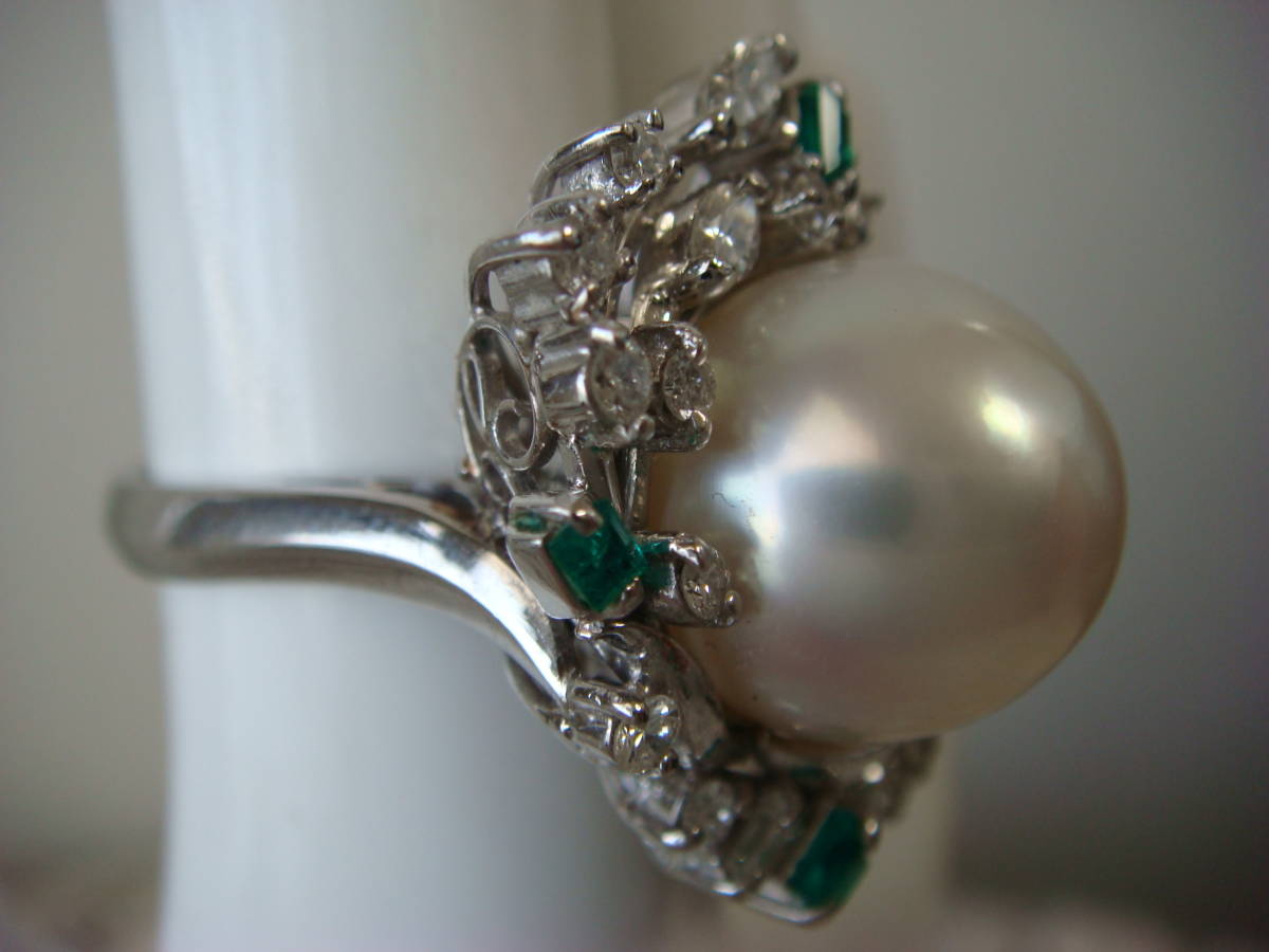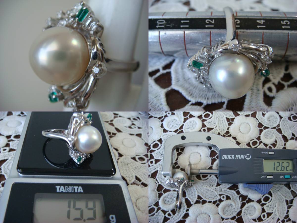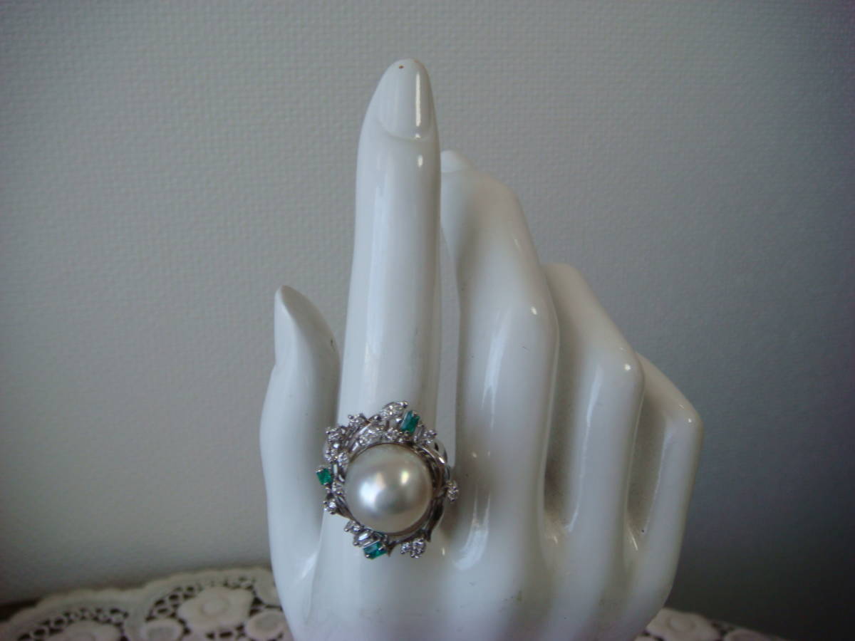 綺麗な白蝶真珠&エメラルド&ダイヤモンドリングです。サイズは約12,5です。プラチナ製。PT900の刻印入り。