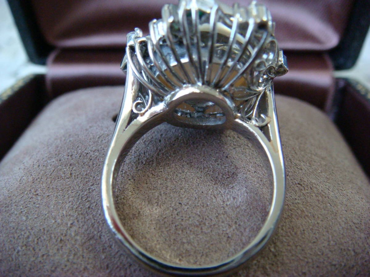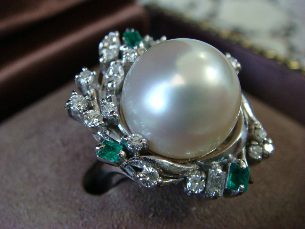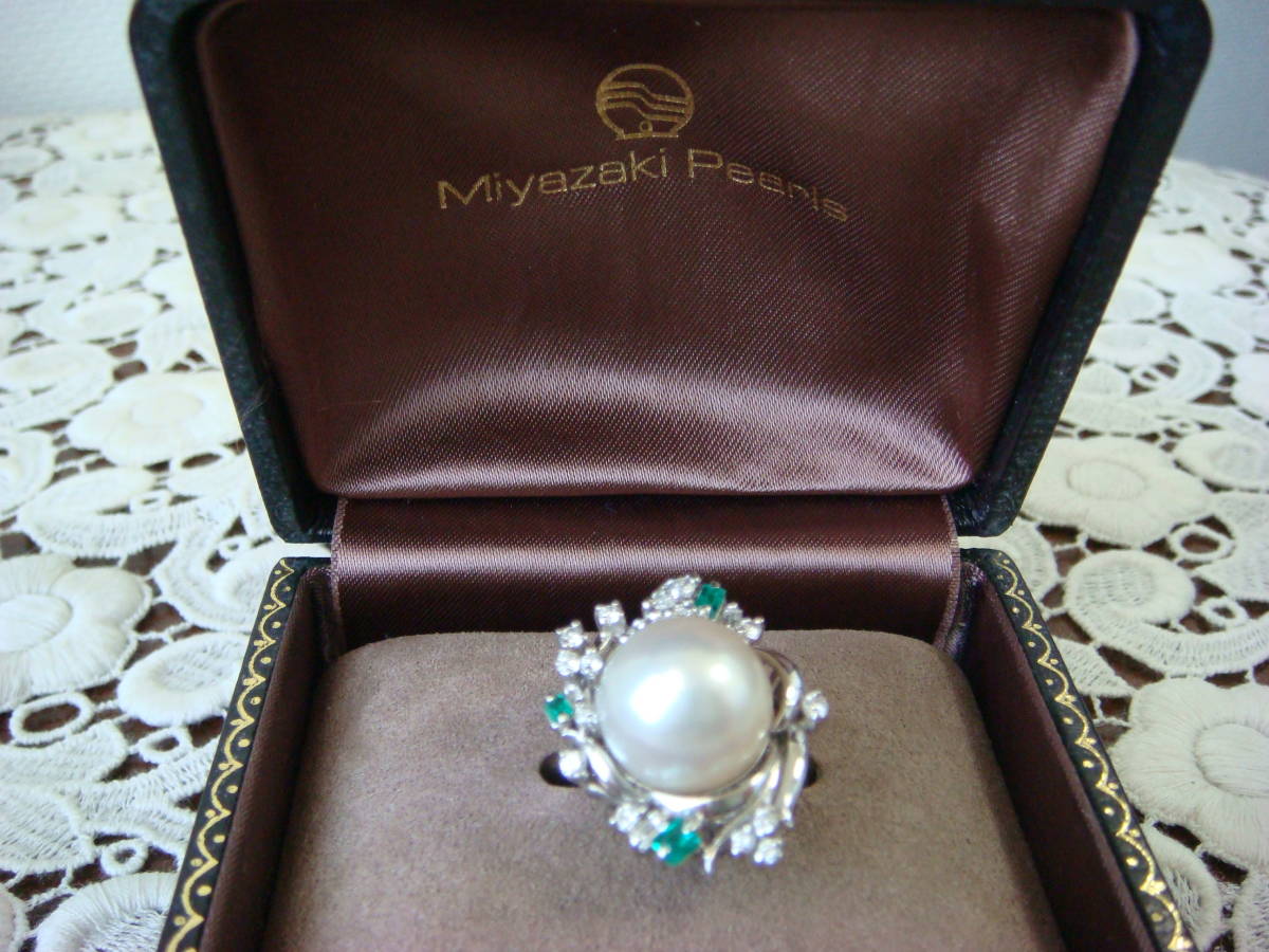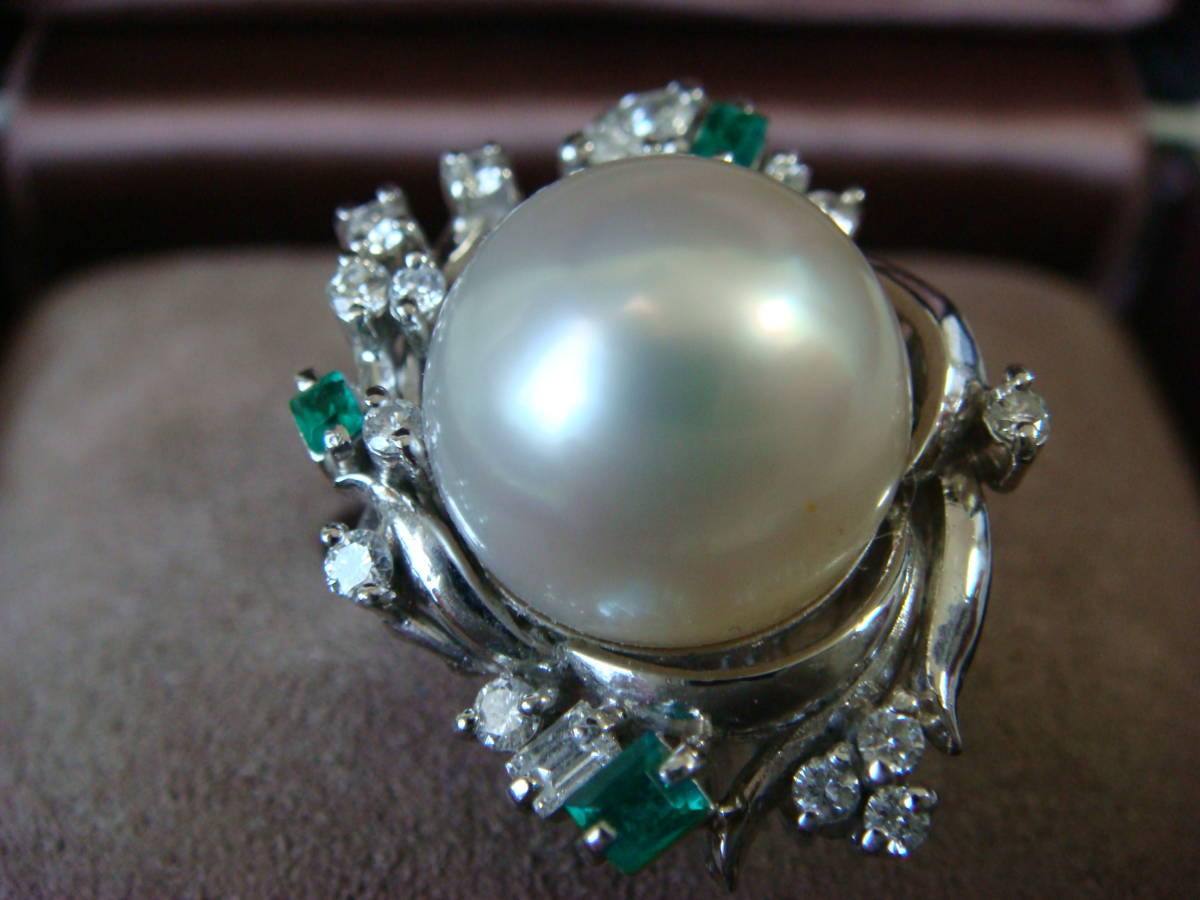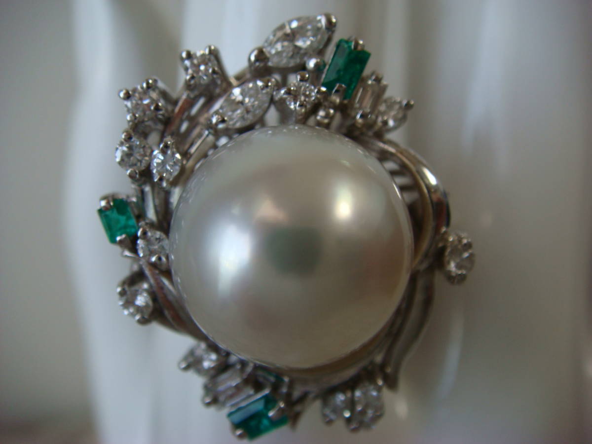 綺麗な白蝶真珠&エメラルド&ダイヤモンドリングです。サイズは約12,5です。プラチナ製。PT900の刻印入り。