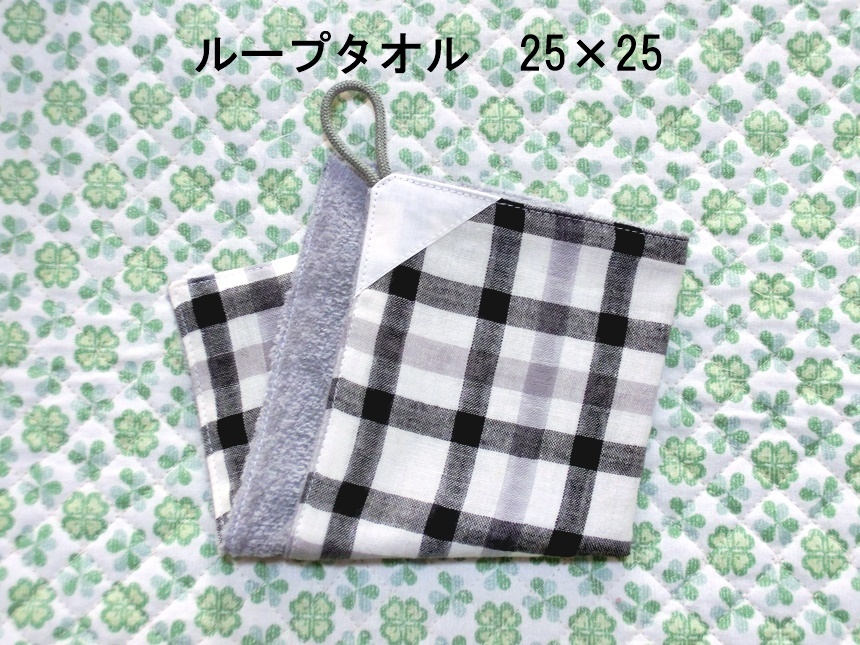 ハンドメイド・正方形25×25センチのダブルガーゼ&タオルで仕上げました、ループ付きタオルハンカチです。 ループの角は名前テープを縫い付けていますので、油性ペンで直接お名前を記入できます。 薄すぎず、厚すぎず、吸水性と速乾性にこだわりました。 型崩れ防止のために、ぐるっと一周ステッチをしてあります。 タオル生地は、肌触りが柔らかく気持ちのいいループをカットしてある国産シャーリングタオル生地を使用しております。 赤ちゃんから大人の方まで、ご使用いただけると思います。 職業用ミシンで作製しました。 手持ちの生地すべては出品できておりません。 出品中の生地でご希望の生地・ご希望のサイズがありましたら質問よりご連絡ください。 生地の在庫がありましたら、対応させていただきます。(タオル生地の色は画像と同じものになります) 商品名にご依頼者様のオーダーと記載し出品させていただきます。 サイズ:25×25センチ 素 材:ダブルガーゼ&国産シャーリングタオル生地 | ||