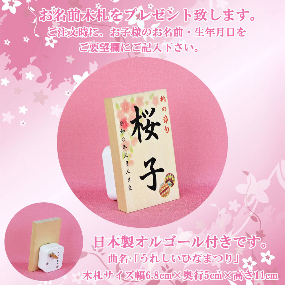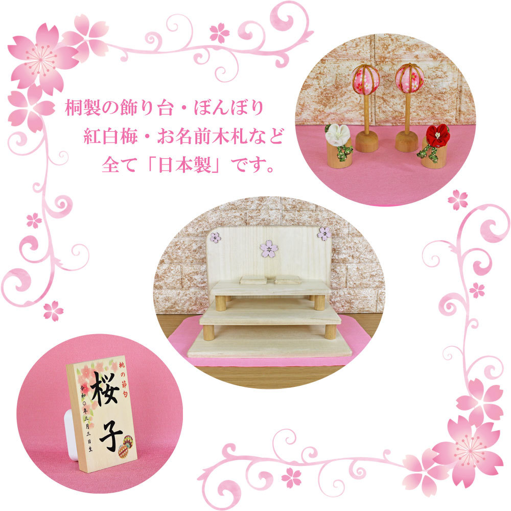 飾り台・雪洞・紅白梅・お名前木札など全て日本製です。角のない「まんまる毛せん」と日本製オルゴール付き