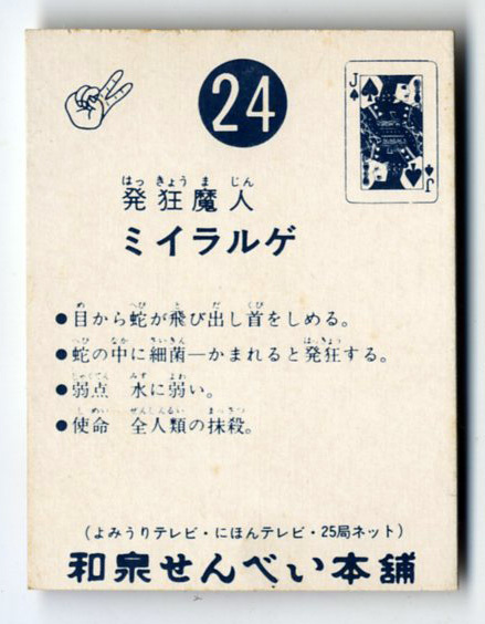 | ●超人バロム1 バロムワン ミニカード 24番 その2 発狂魔人ミイラルゲ 和泉せんべい本舗 さいとうプロ・よみうりテレビ・東映 特撮カード 即決 | |