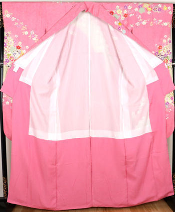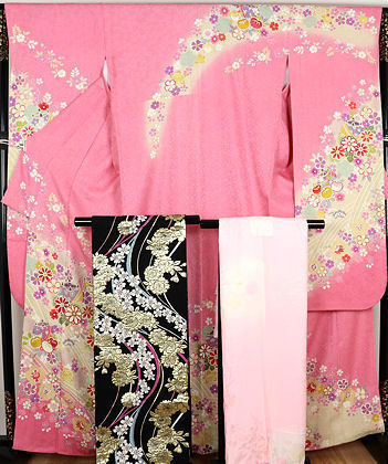 | 本振袖と西陣織袋帯と高級長襦袢のセット 振袖 袷 丹後縮緬地 ピンク・黄緑暈し地桜・橘・菊・糸車 172 広襟 西陣織袋帯 黒金箔地桜花 仕立て上がり 高級長襦袢:単衣 袖無双 刺繍襟付き 居敷当て付き ピンクぼかし地辻が花 | |