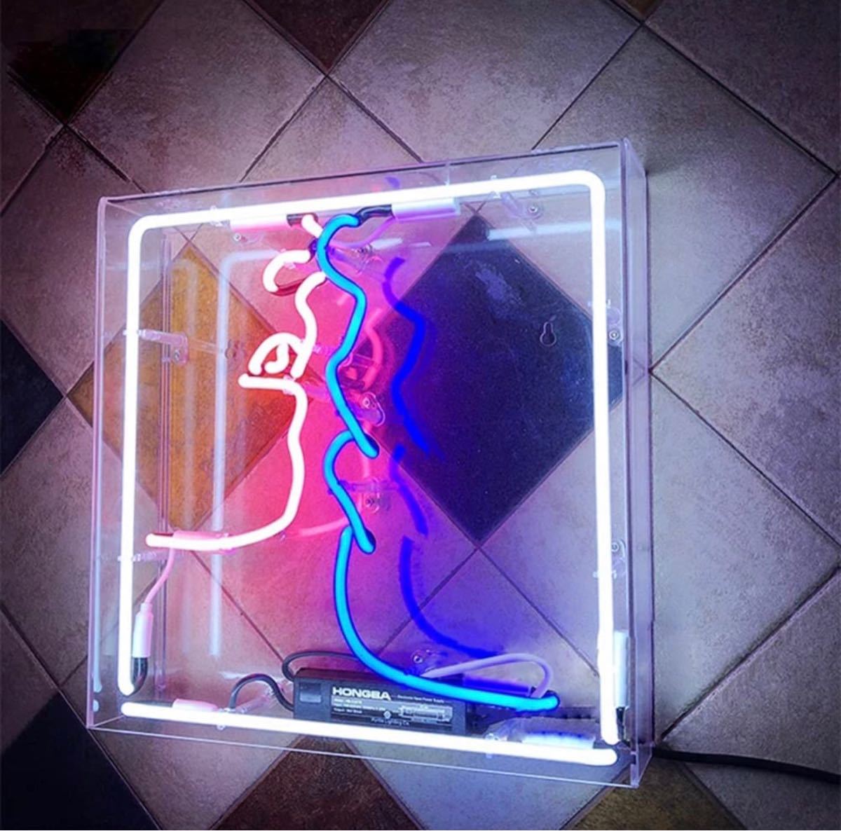 ピンク・ブルー・ホワイトのネオン管で描かれた女性の横顔アートが印象的なデザインネオンサインです。幻想的な光のコントラストが空間にアクセントを与え、インテリアやショップの装飾、撮影用の背景などにぴったりのアイテムです。34×34cmのコンパクトなボックスタイプで、壁に掛けても、棚の上に飾っても映える存在感があります。ガラス管ならではの柔らかな光と、ヴィンテージ感のある雰囲気が魅力です。