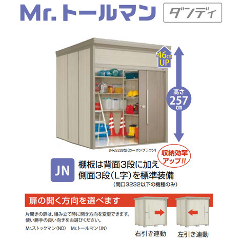 ・中・大型物置のJNシリーズ。扉の色は4色から選択可能です。