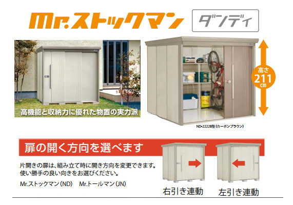 中・大型物置のNDシリーズ。扉の色は4色から選択可能です。