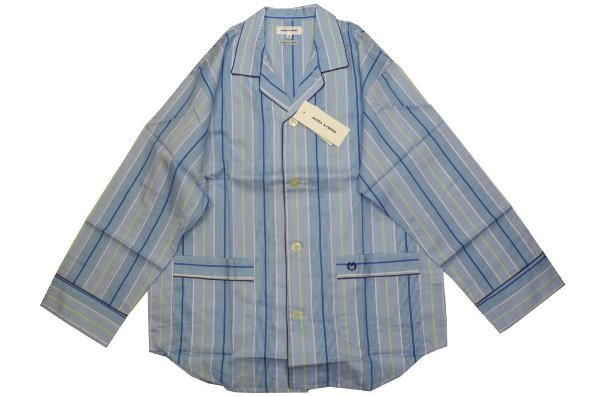 ■ミラショーン mila schonの男性用、テーラー型長袖&ロングパンツパジャマ、新品です。サイズはM、チェスト88-96cm、身長165-175cm、ウエスト76-84cm。パンツは前開き。フロント2か所ポケット付き、ロゴマークの刺繍入り。素材は綿100%、オールシーズンでお使いいただける生地感です。色はブルー系。正規ライセンス会社扱い品の日本製です。