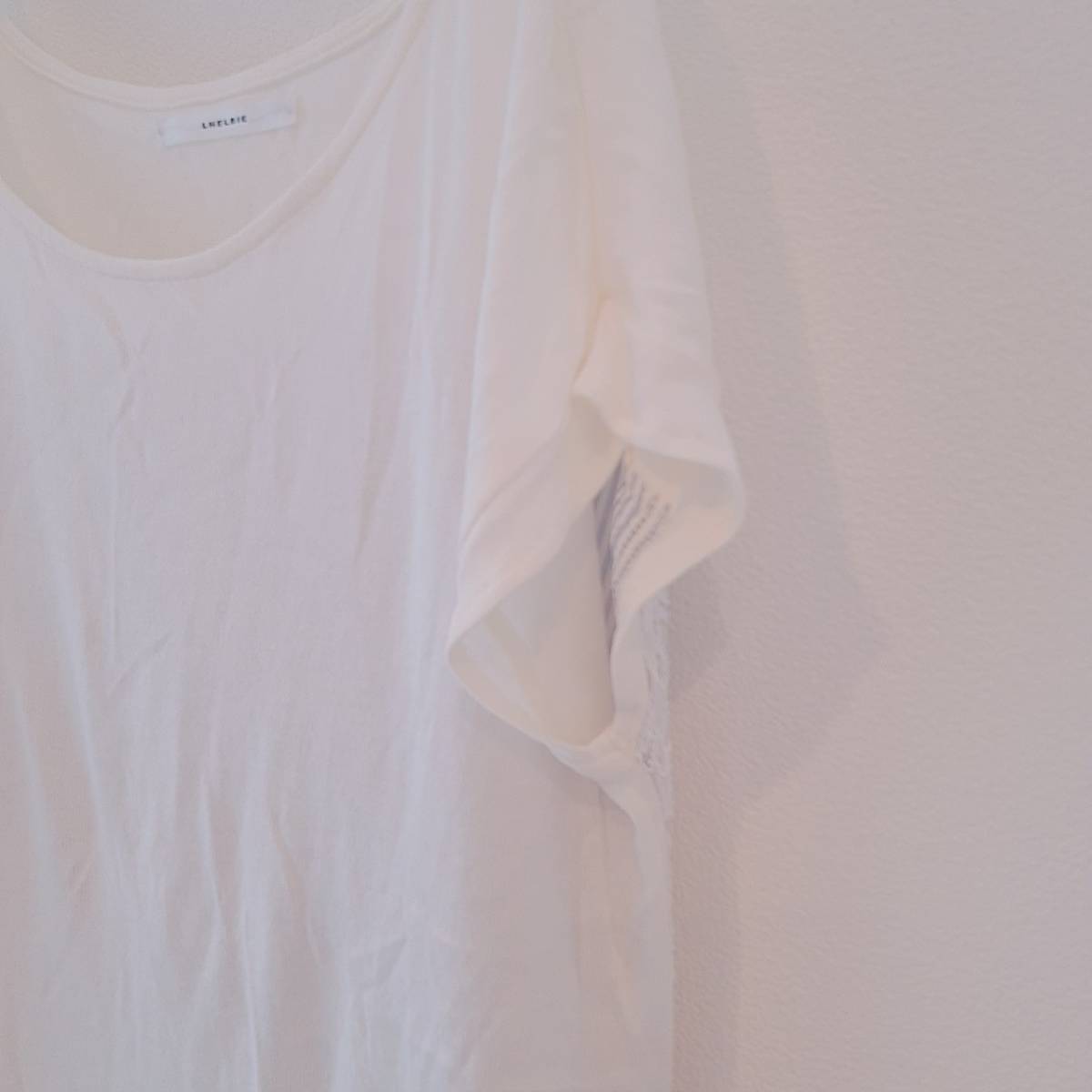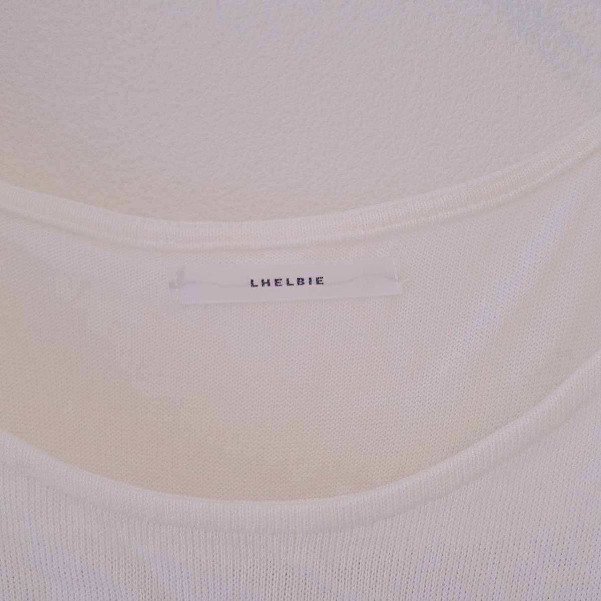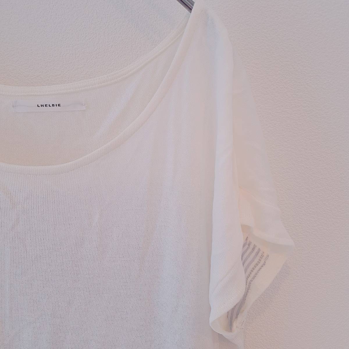 | LHELBIEの半袖カットソーです。前面は白ですが、背面はブルーと白のストライプにレース生地が重なり、涼やかな印象に。 |