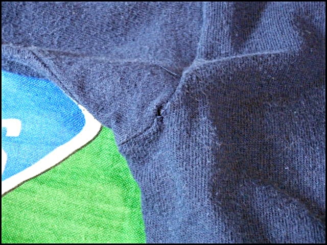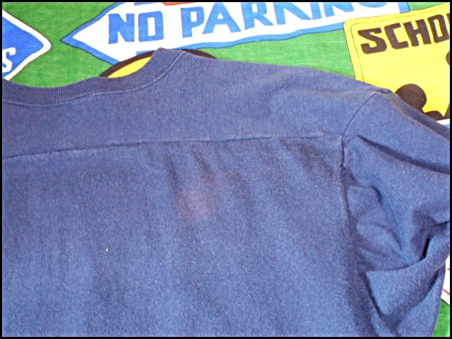 襟リブ下、右脇下に小穴、背中に少し染み汚れが見られます。その他、USED相応の着用感があります。