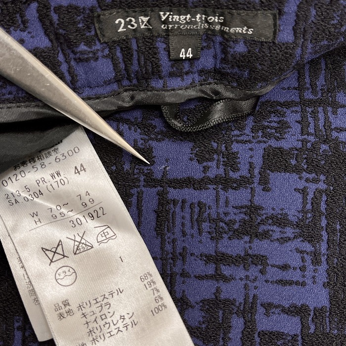 | 商品タイトル | 23区 - 44 レディース 総柄 テーパードパンツ 膝あたりまで裏地付き 日本製 ポリ×キュプラ×ナイロンなど ネイビー×ブラック 紺 |