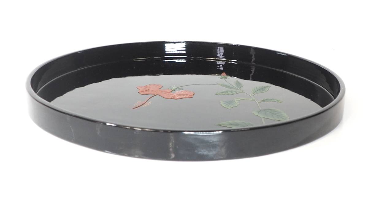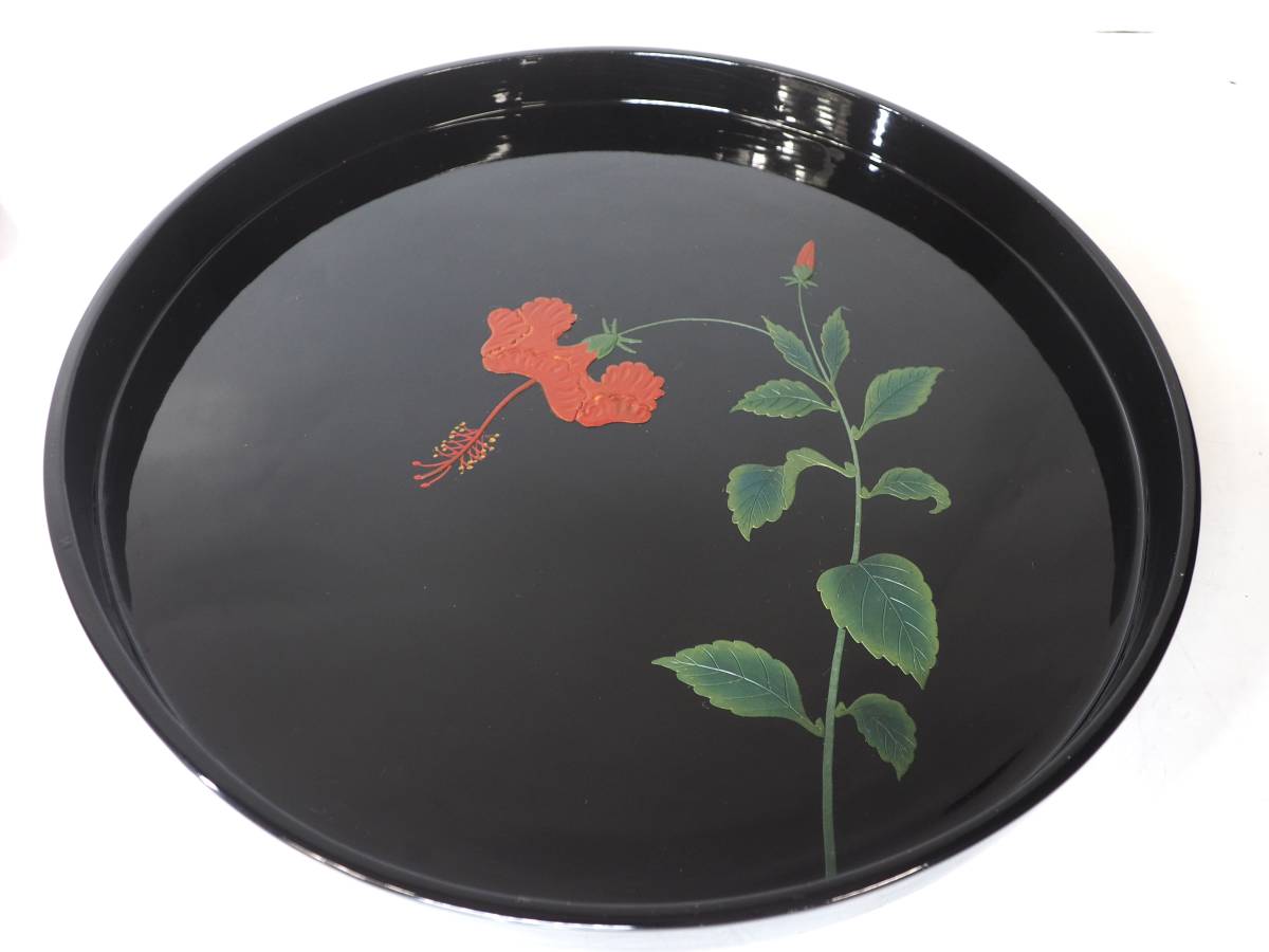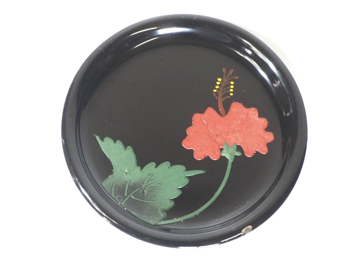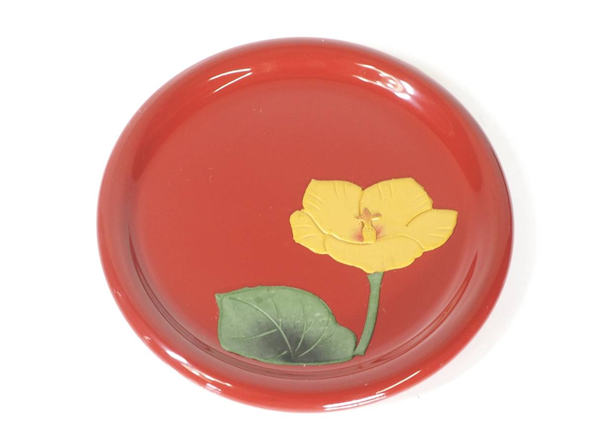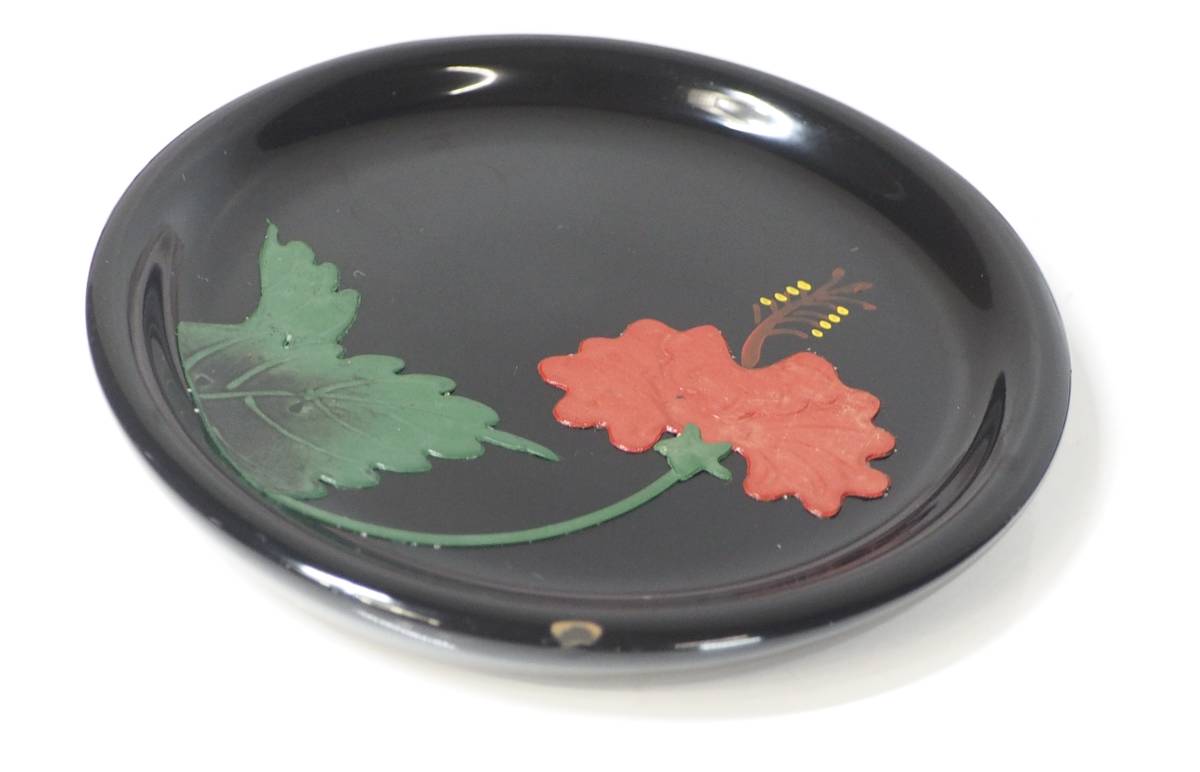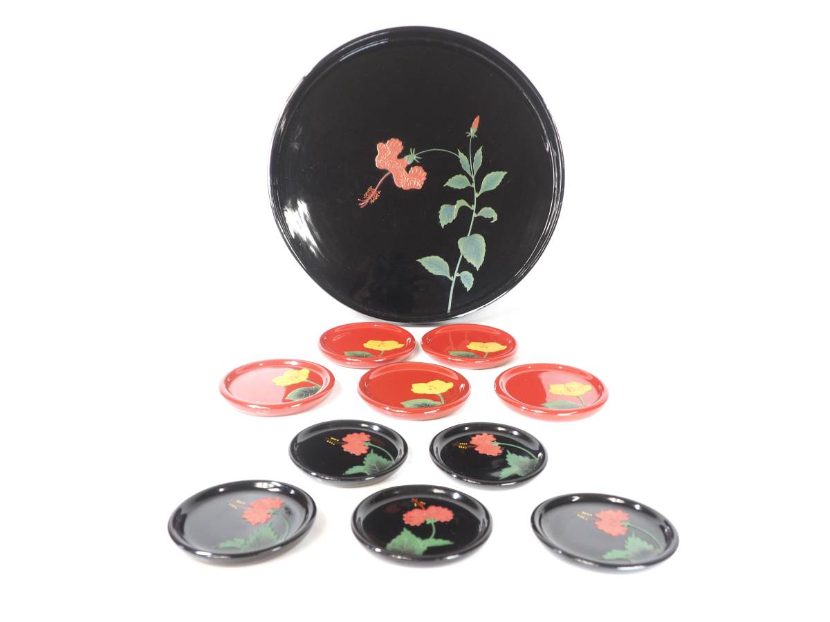 鮮やかで美しい沖縄の伝統的な漆器「琉球漆器」のお盆と茶托です。漆に顔料を混ぜ他独特な手法「堆錦」によるハイビスカスの花が印象的です。