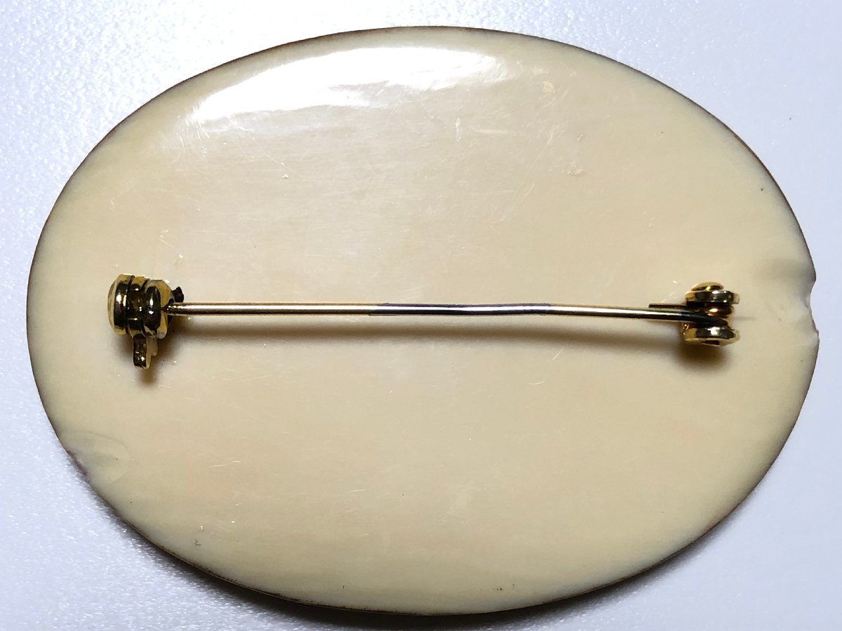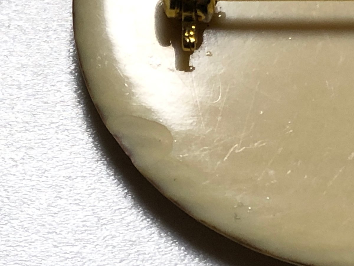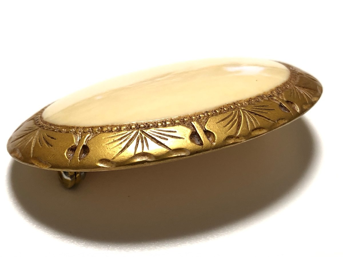 AKIO MORI(アキオ モリ)の金蒔絵を施した、アーカンサス模様の楕円形ブローチです。裏面に2ヵ所の欠けがあります。