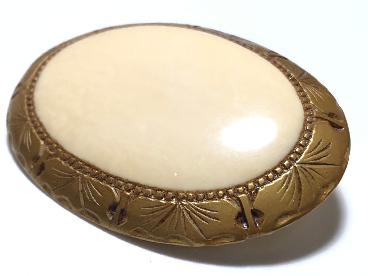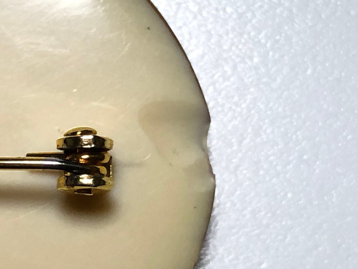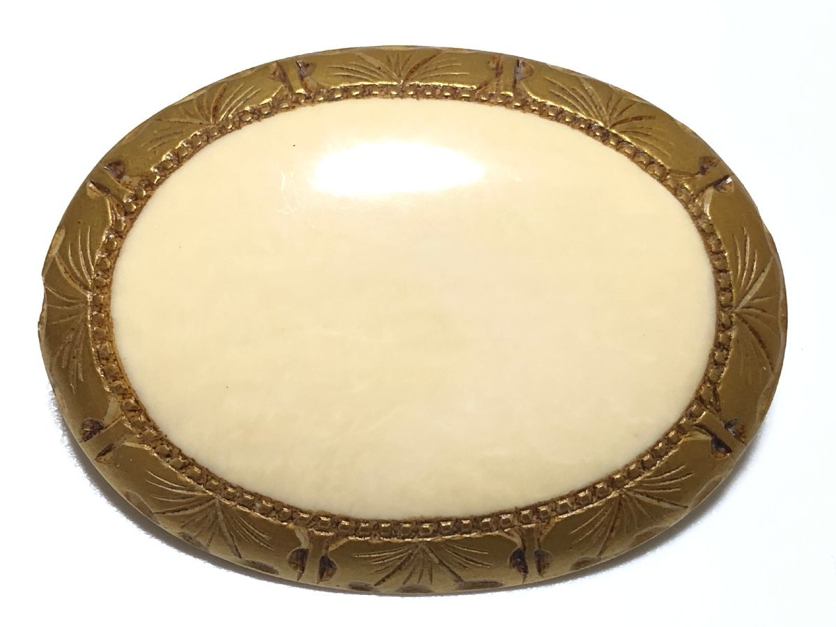 AKIO MORI(アキオ モリ)の金蒔絵を施した、アーカンサス模様の楕円形ブローチです。裏面に2ヵ所の欠けがあります。