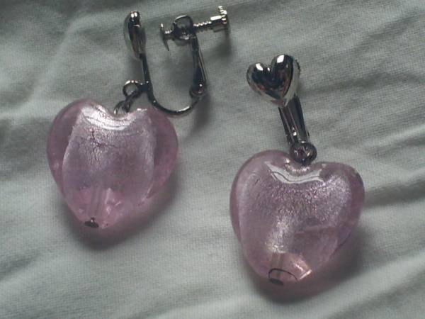 新品・ハンドメイドです。 一つ一つ手作りで味のある銀箔入りのベネチアングラスのハートを使って 作りました。 イヤリング金具はネジ羽式で、イヤリング金具のかんにもハートがついています。 ハートのサイズ 2cmx2cm カラー ハート 銀箔入りのライトピンク 金具は銀色(メッキ)です。 |