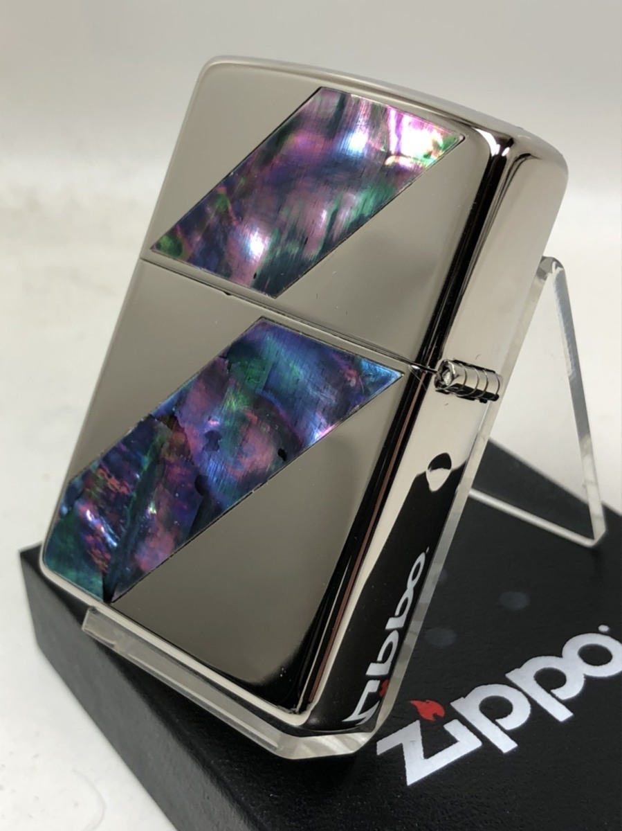 ★Zippo Shell Inlay LINE 天然貝貼り両面 、 シルバーベース「豪華な貝張り/天然貝象眼」、天然蝶貝インレイ、ハンドメイド感溢れる豪華な逸品。複雑な造形のため見る角度によって写りが変わります(両面貝貼り)、