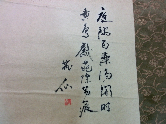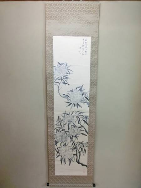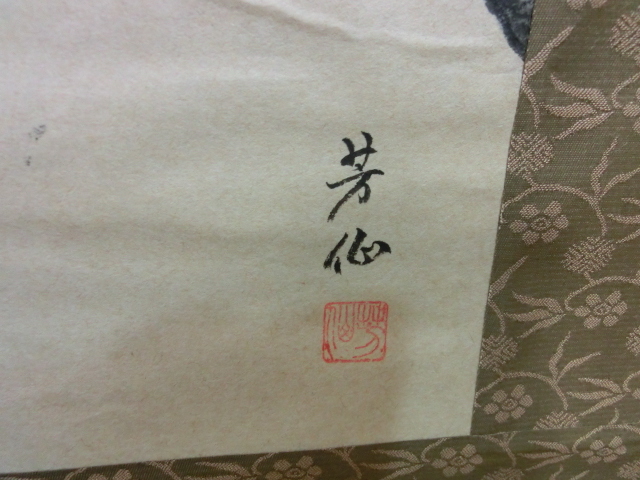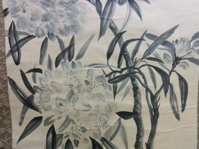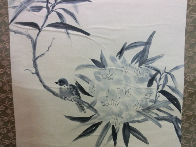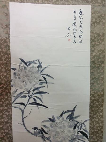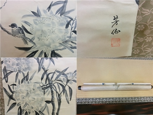 掛軸■水墨画 ツツジ 雀 芳仙 花図 肉筆 骨董品 掛け軸 床掛け■(27)