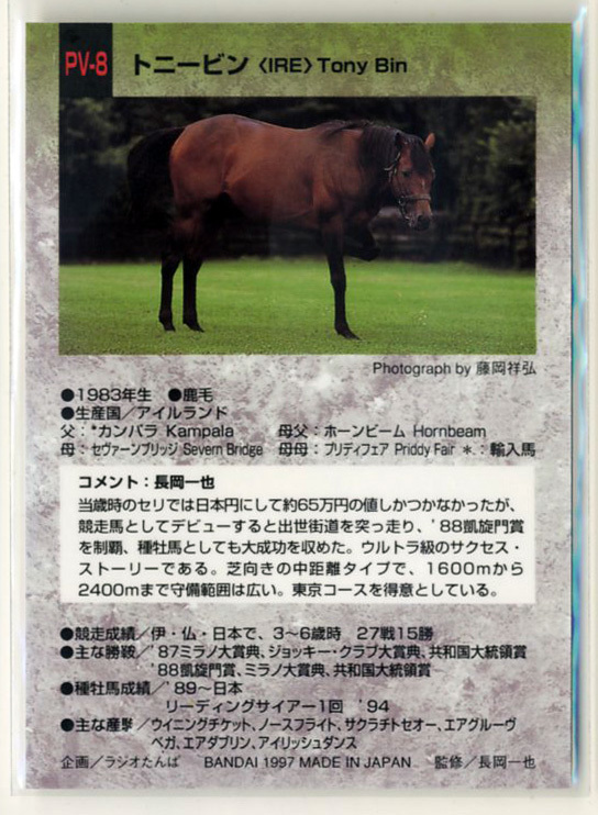 | ★トニービン PV8 リーディングサイアーカード バンダイ サラブレッドカード 97年上半期 PV版 代表産駒=エアグルーヴ(優駿牝馬、天皇賞(秋)) 競馬カード 即決 | |