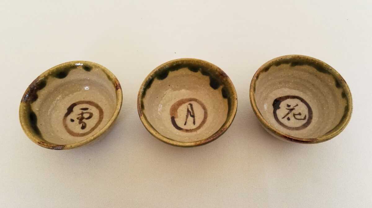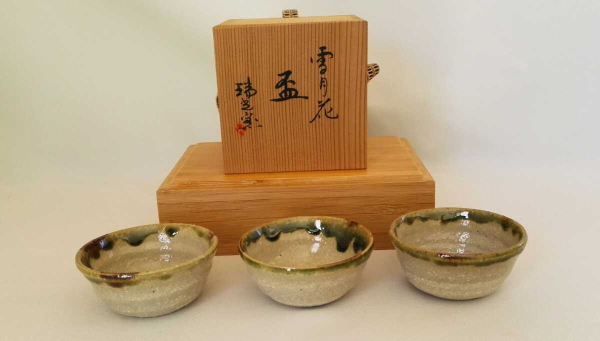 [未使用]美濃焼 岐阜県 瑞光窯 佐々木八十二 雪月花 陶器 織部焼 酒器 盃 3客 しおり★02V-449 の出品になります。